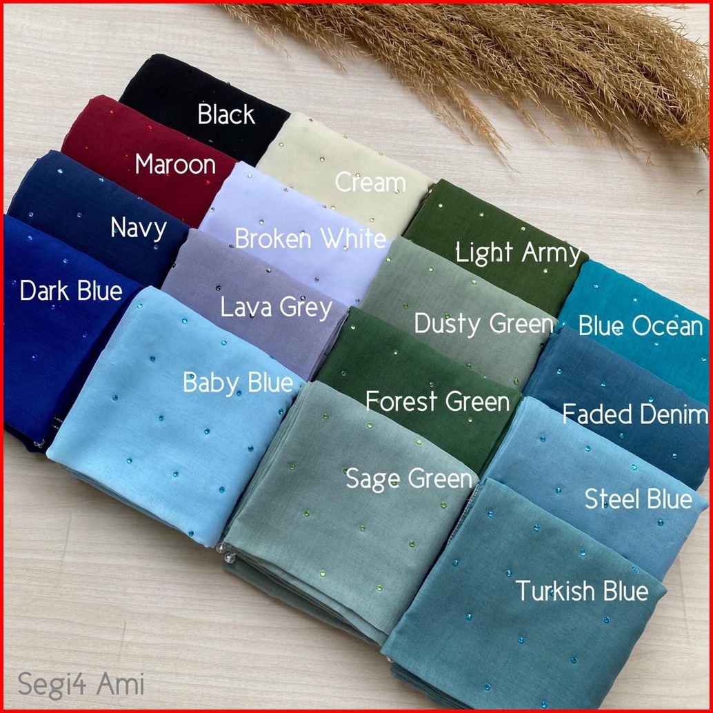 Dusty Violet, natural, Grey Blue, Grey Denim, Black, Broken White, Carnation Pink, Deep Purple, Maroon, skin, Dusty Plum, Electric Blue, Dark Frapucino, Mahogany, Olive sheen, Grey, Baby Green, Yellow Olive, Dark Bata, Thai Tea, Dusty Blue, Steel Blue, Aqua Blue, Bata, Nude Brown, Rouge, Medium Purple, Dark Mustard, Canary Mustard, Medium Brown, Zaitun, Gading, Terracota, Soft Zaitun, Dusty Green, Green Mint, Olive Sheen, Green Leaf, Flower Blue, Dusty Army, Mulberry, Orchid Mauve, wood mauve, Pink Chalk, Ruby Pink, Lips, Candy Pink, Plum, Warna Lainnya, Salem