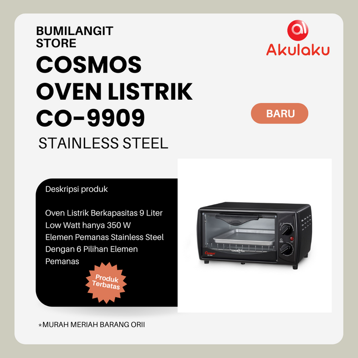 COSMOS OVEN LISTRIK CO-9909 STAINLESS STEEL LOW WATT 350W KAPASITAS 9 LITER DENGAN 6 PILIHAN ELEMEN PEMANAS