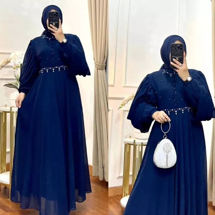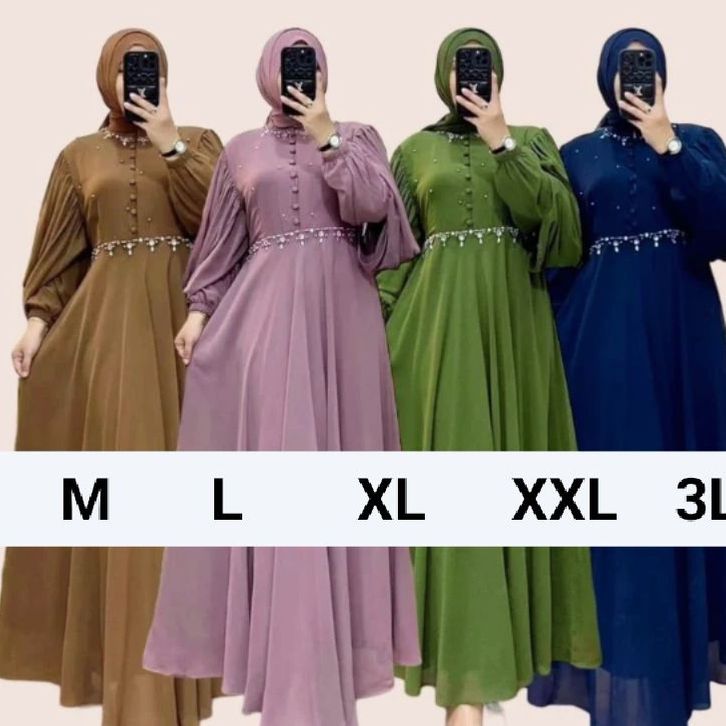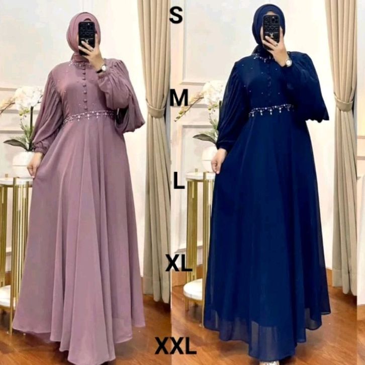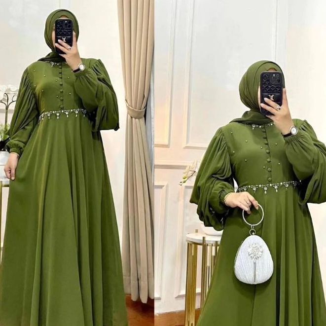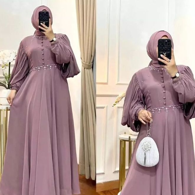 Gamis Wanita Stylish Pesta Fashion Pakaian Muslim Elegan Mewah Kekinian Bahan Ceruty Babydoll Aplikasi Mutiara Nyaman