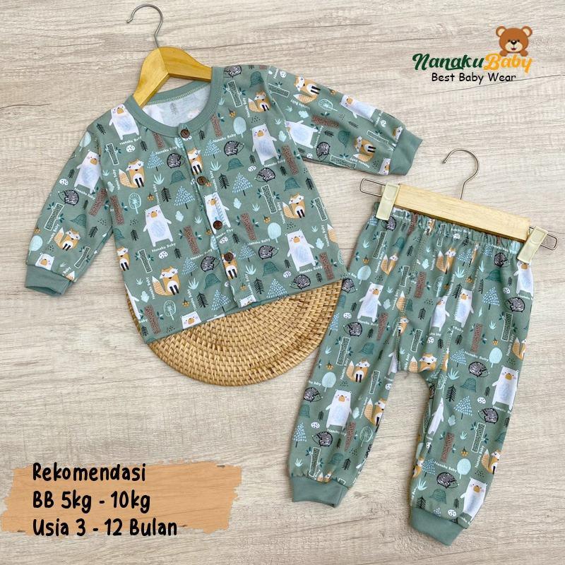 Nanaku Baby - Set Piyama Bayi Lengan Panjang Kancing Depan Usia 3-12 Bulan Motif Printing Pohon Landak