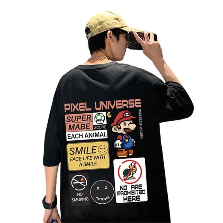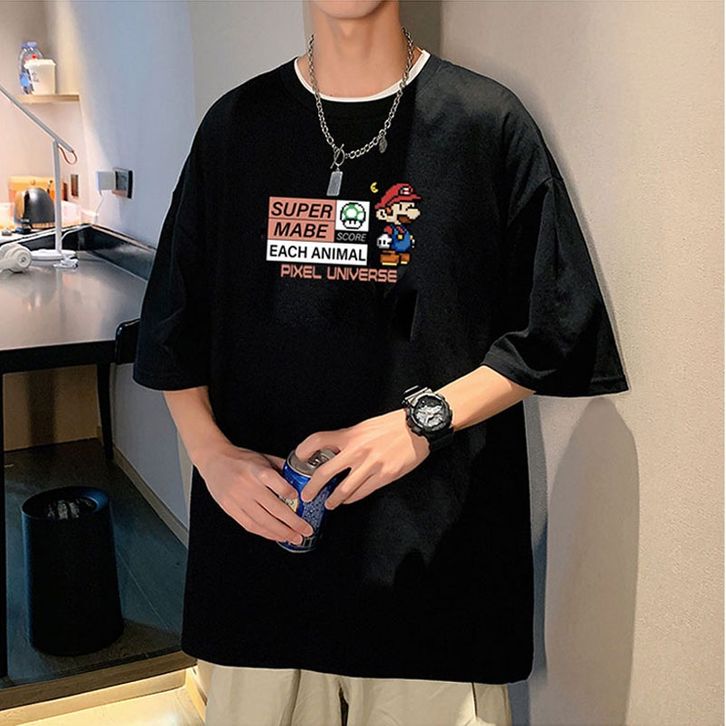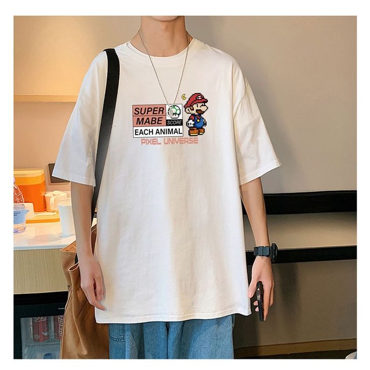 Kaos Oversize Cowok Wanita Atasan T Shirt Cowo Cewe Cartoon Printing Top Korean Style Hitam Putih Katun Bahan Combed
