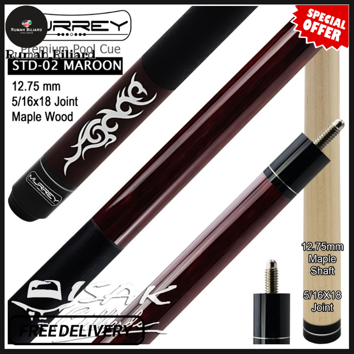 Murrey STD-2 Maroon - Maple Pool Billiard Cue Stick - Stik Biliar - Merah Maron