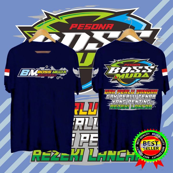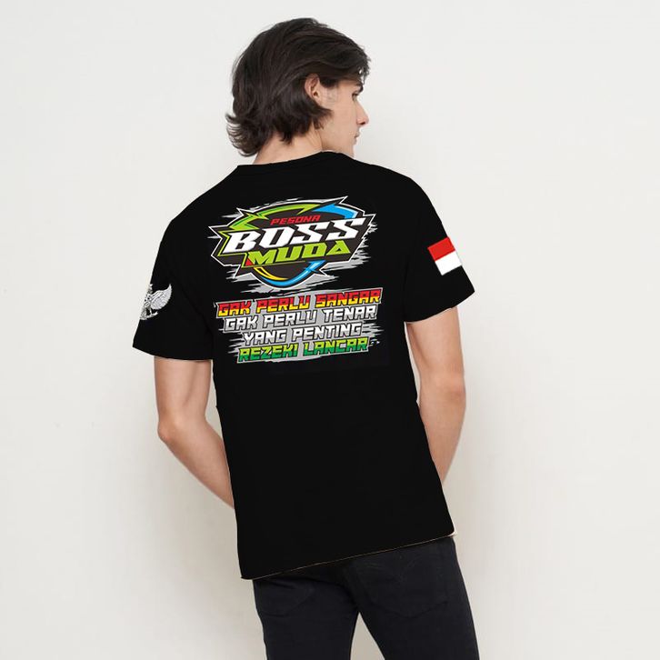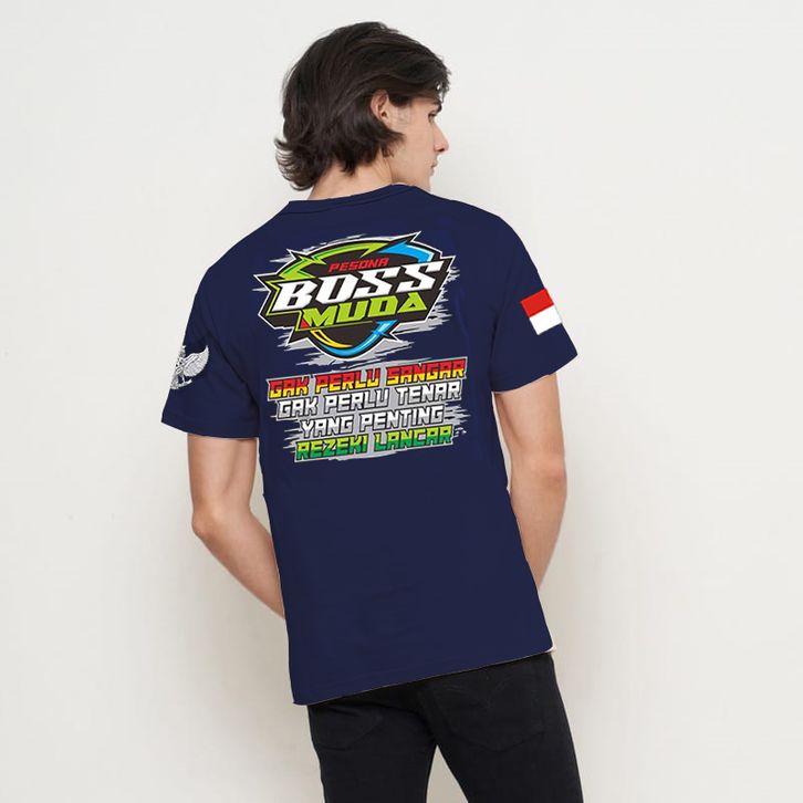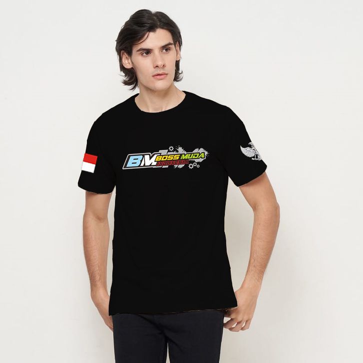 Kaos Cowok BM Bos Muda Atasan Baju T Shirt Cowok Kata Kata Sablon Simple Dinamis Lengan Pendek Hitam Navy