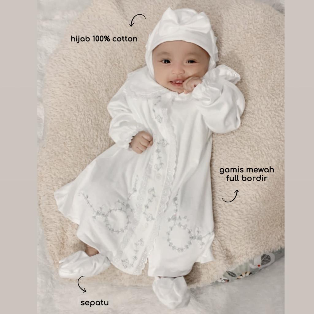 GAMIS MEWAH AQIQAH /PURE WHITE BAJU SETELAN DRESS MUSLIM LEBARAN BAN SEPATU LUCU CANTIK ANAK BAYI PEREMPUAN TERLARIS