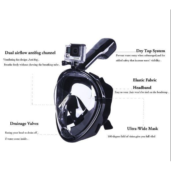 Kacamata Helm Snorkling Full Face Anti Embun size L-XL ada Slot Gopro Material PC PVC dan Silikon Sesuai Gambar