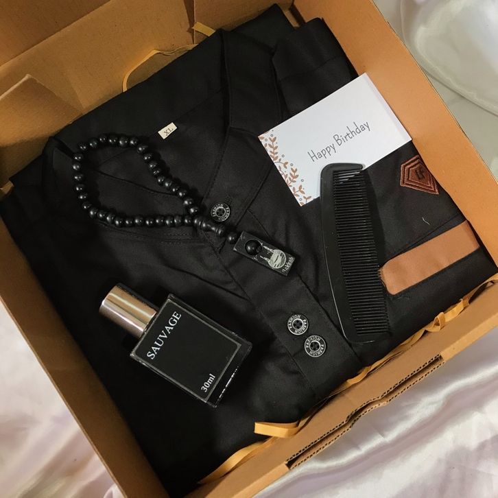 Hampers Baju Koko Cowok Gift Box Ramadhan Lebaran Sarung Tasbih Parfum Kado Ultah Pacar Hadiah THR Keluarga