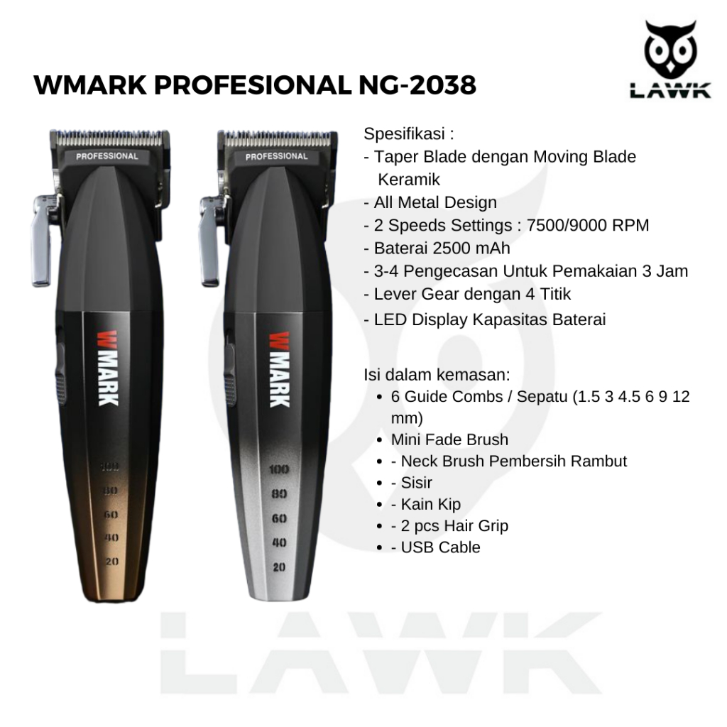 WMARK NG-2038 PROESIONAL HAIR CLIPPER DUAL SPEED 7500-9000 RPM