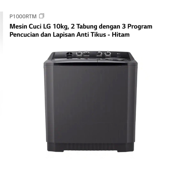 LG MESIN CUCI 2 TABUNG 10KG T0P LOADING P1000RTM WIND JET DRY P1000