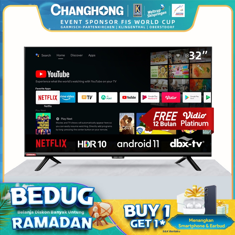 CHANGHONG 32 INCH NEWEST ANDROID 11 FRAMELESS SMART TV DIGITAL LED TV HD (L32G7N) GARANSI RESMI
