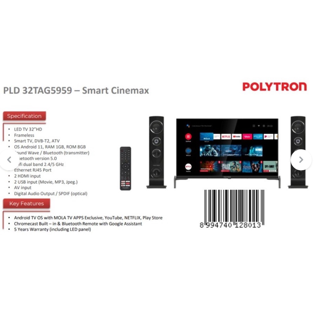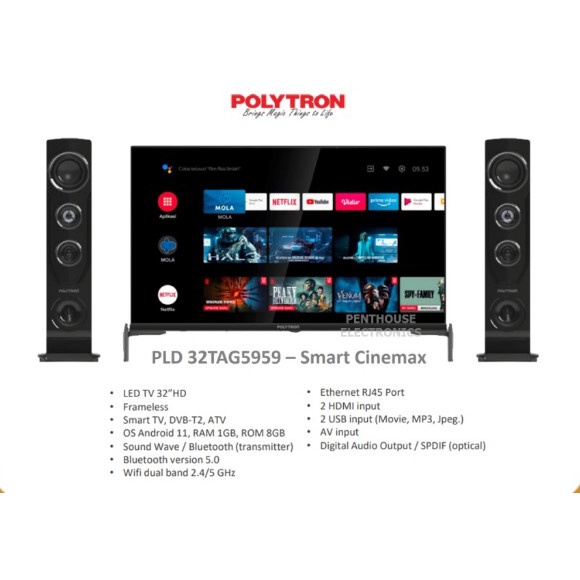 POLYTRON LED SMART ANDROID TV 32" + SPEAKER TOWER PLD 32TAG5959 DVB-T2
