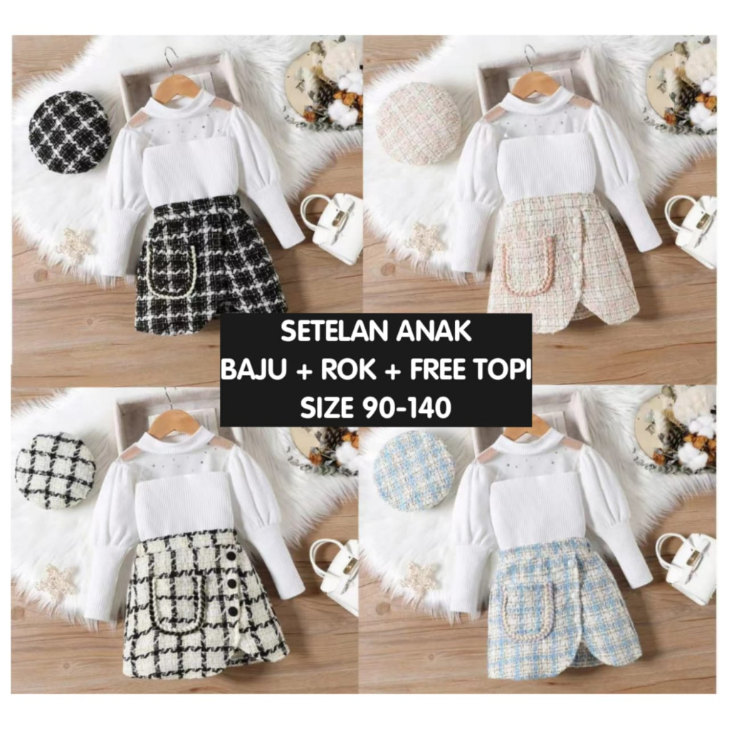 (LOLI-JKT) BS- 508 SETELAN ANAK CEWEK BAJU + ROK TTWEED + TOPI Gems SIZE 90-140