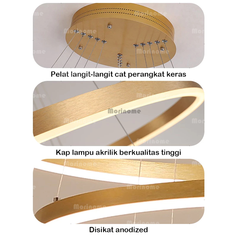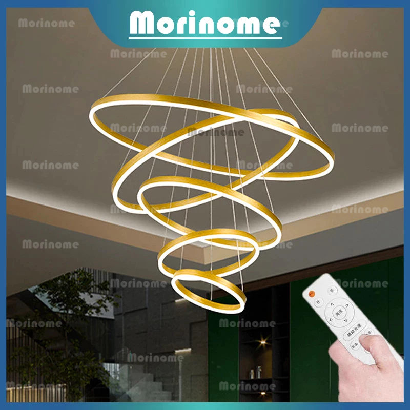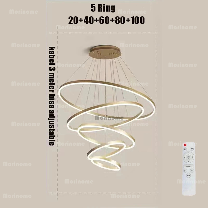 Lampu Gantung Ruang Tamu Lampu Hias Gantung Tangga Void 5 Ring 300W LED 3 Warna 120Cm 100Cm Gold Minimalis Modern