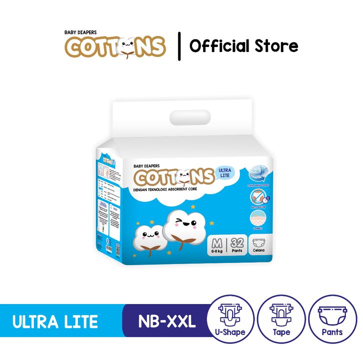 Cottons Baby Diapers - Ultra Lite Popok Bayi NB/S/M/L/XL/XXL Popok Bayi/ Popok Sekali Pakai/ Popok Nyaman/ Popok Bayi Le