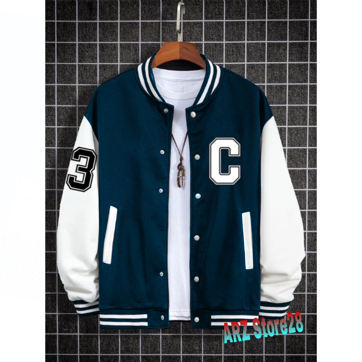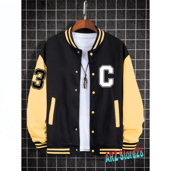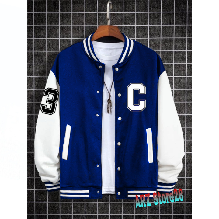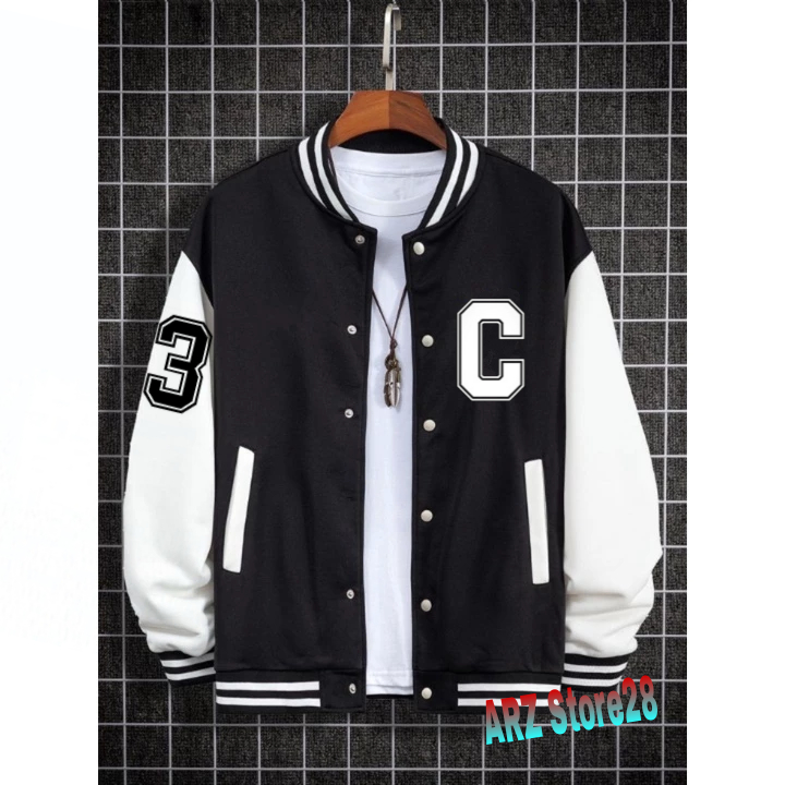 JAKET VARSITY KANCING TEXT PUTIH LOGO C /3 HITAM SWEATER DISTRO TERMURAH HOODIE TERBARU PRIA WANITA