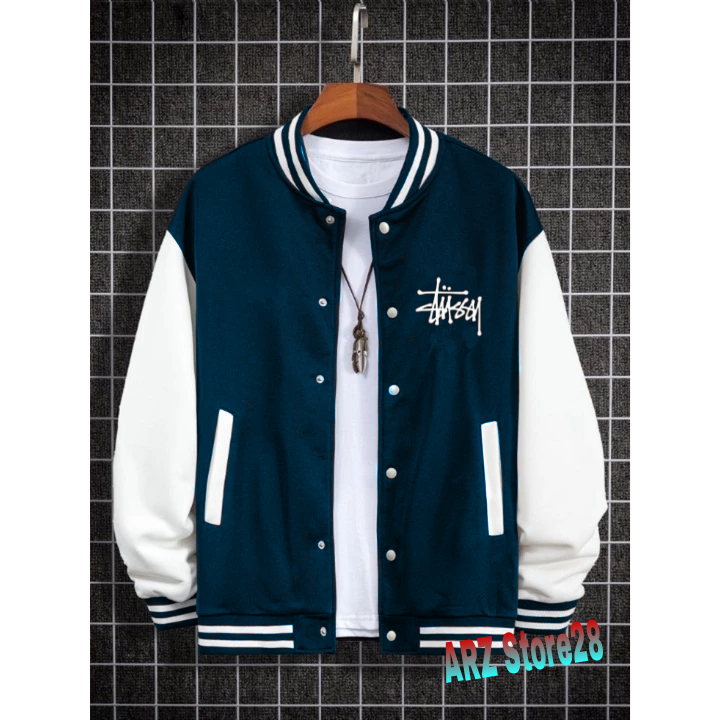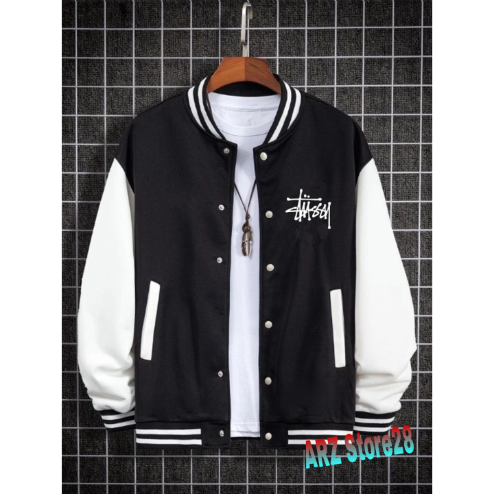 JAKET VARSITY KANCING TEXT PUTIH STUSSY RILEX SWEATER DISTRO TERMURAH HOODIE TERBARU PRIA WANITA KEKINIAN