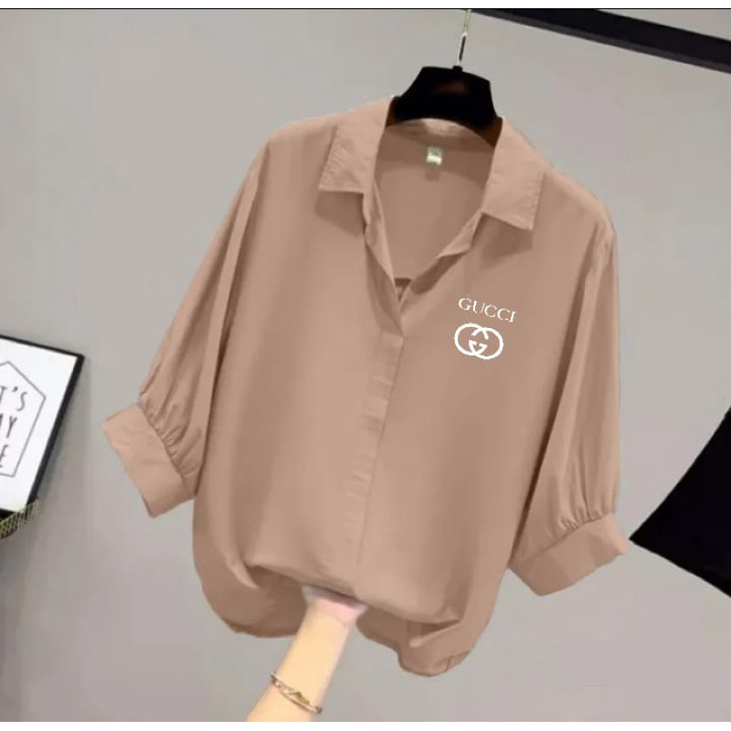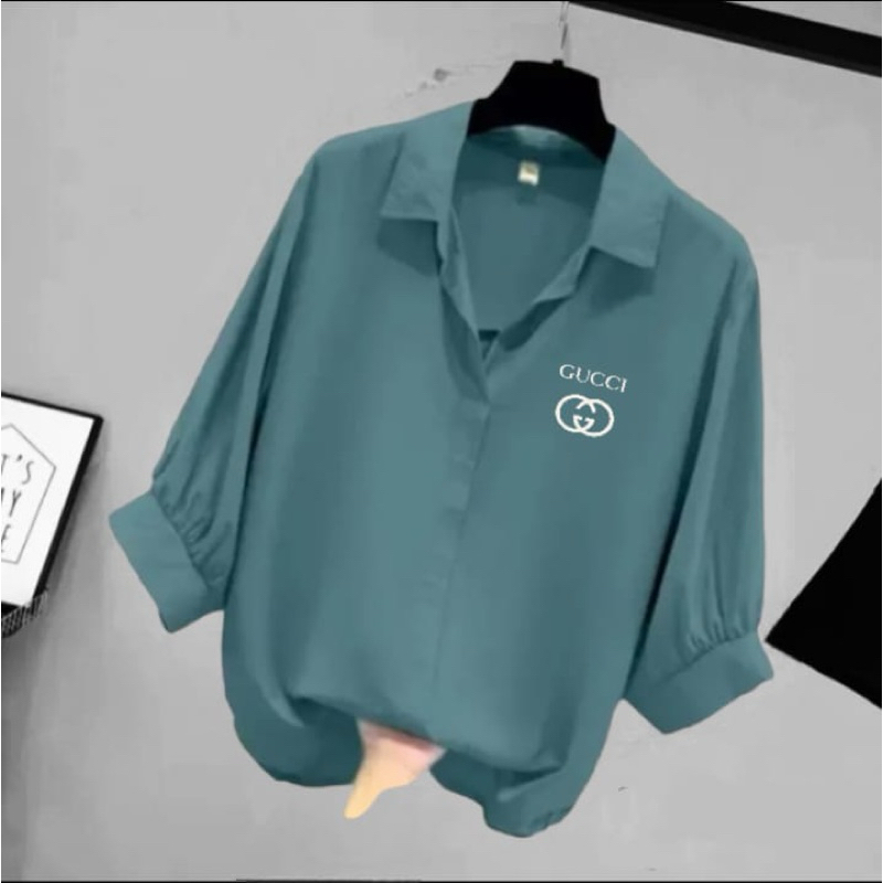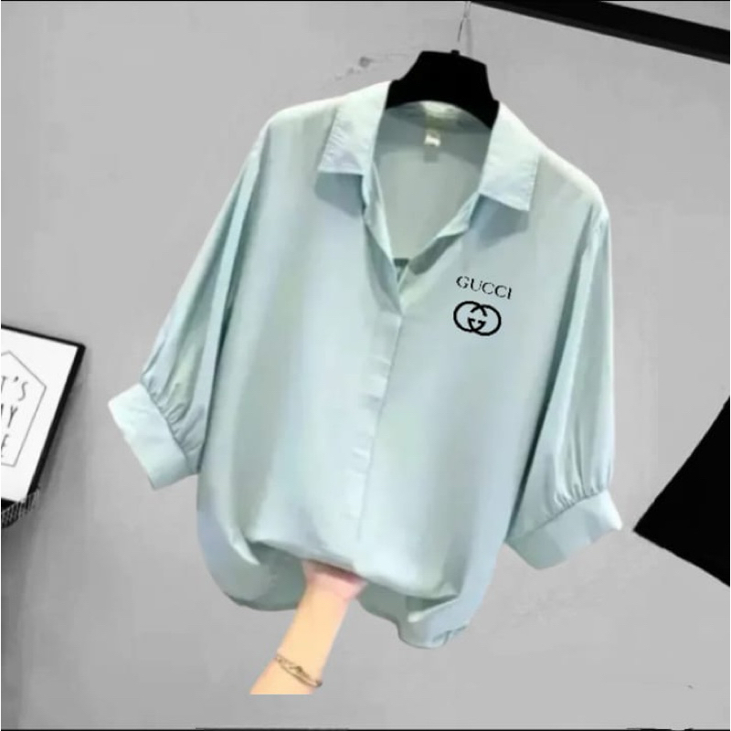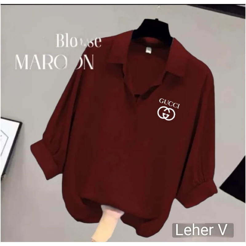 BLOUSE WANITA LEHER V LOGO SAMPING / KEMEJA WANITA V KOREAN STYLE / BAJU WANITA LENGAN BALON 3/4