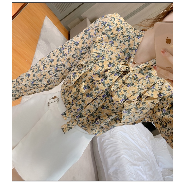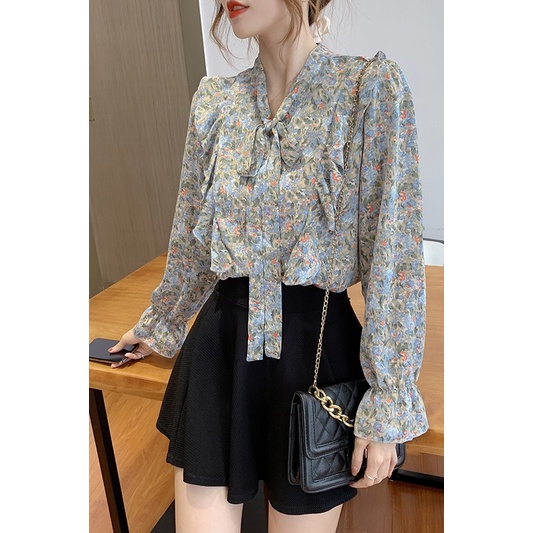 KOREA STYLE LENGAN PANJANG BLUS WANITA MUSIM PANAS CASUAL BLOUSE MOTIF BUNGA BAHAN SIFON WARNA PINK ATASAN KEMEJA WANITA