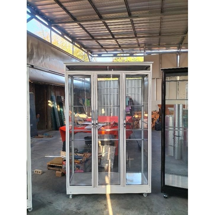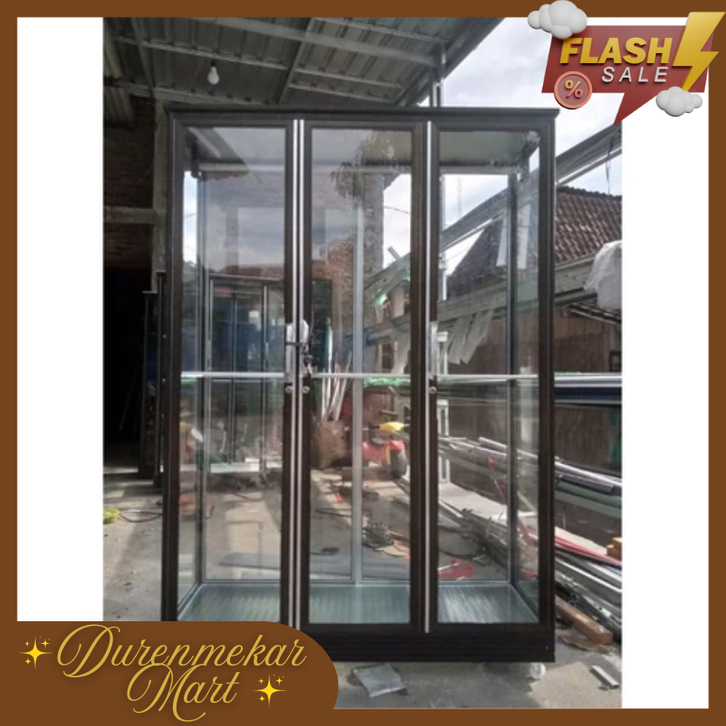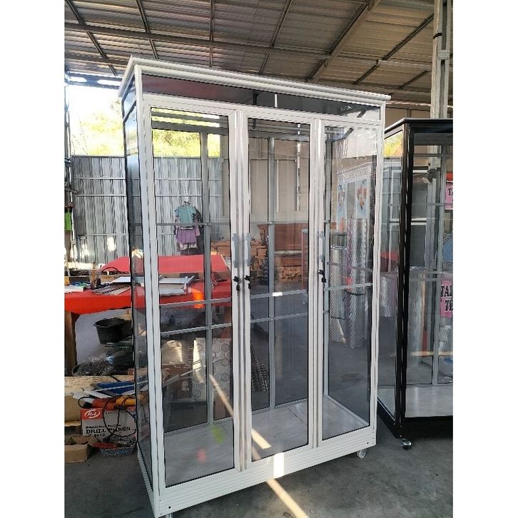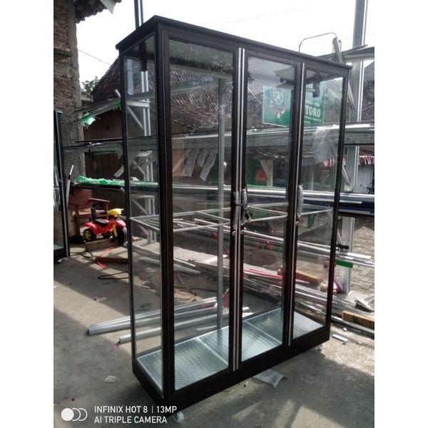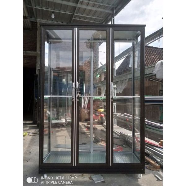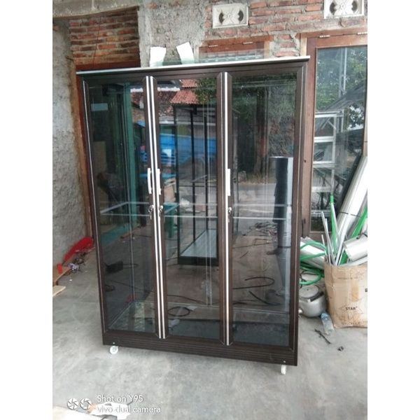 lemari hiasan ruang tamu lemari kaca 3 pintu full gantung / almari pakaian kaca aluminium 3 pintu