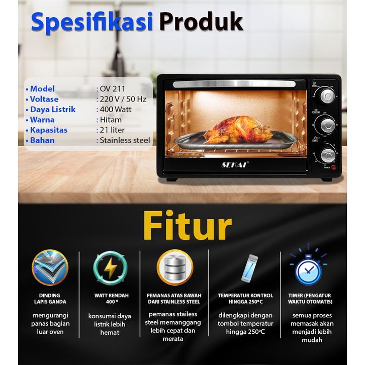SEKAI Oven Listrik Low Watt Kapasitas 18L - 21L / Pemanggang Makanan Serbaguna Rotisserie - OV 180 / OV 190 / OV 210