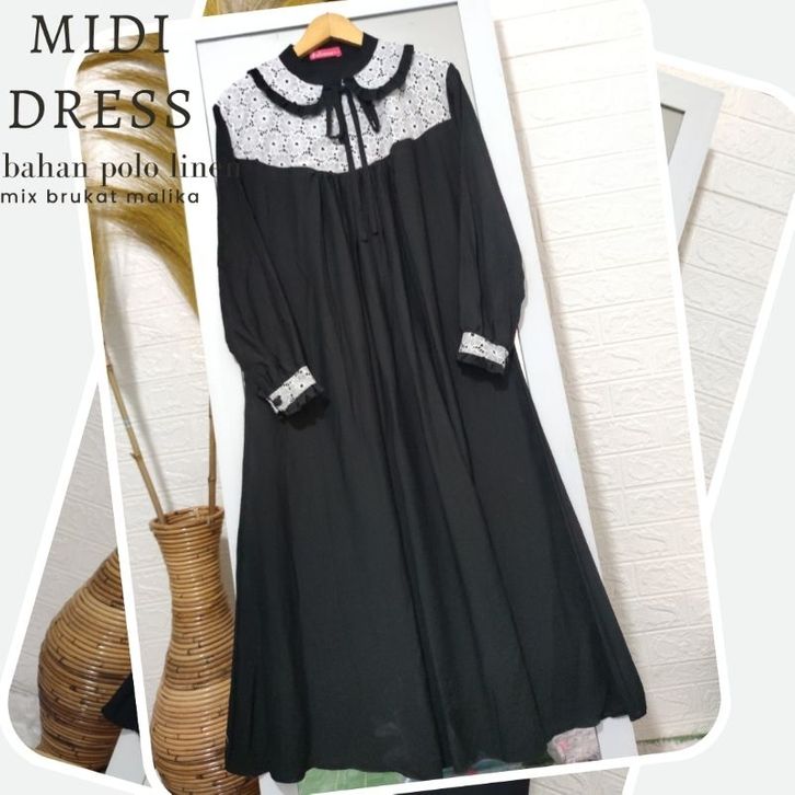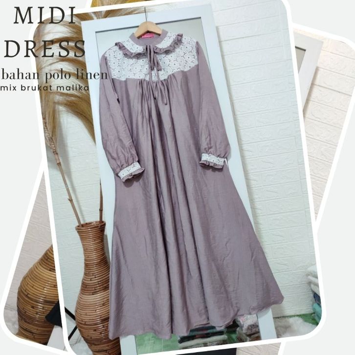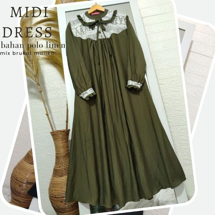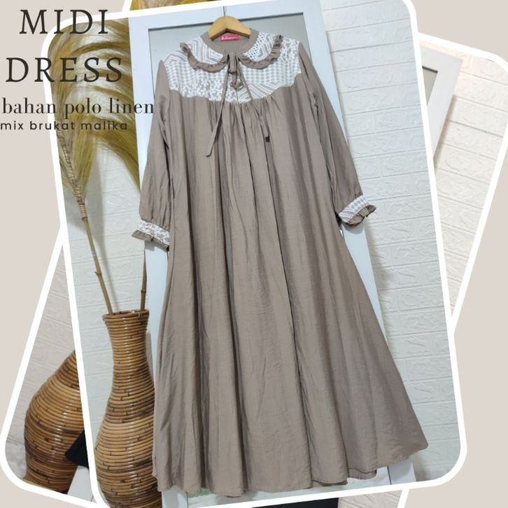 MIDI DRESS TERBARU POLO LINEN BERKUALITAS SILK MAXI BRUKAT MALIKA DRESS LEBARAN 2024