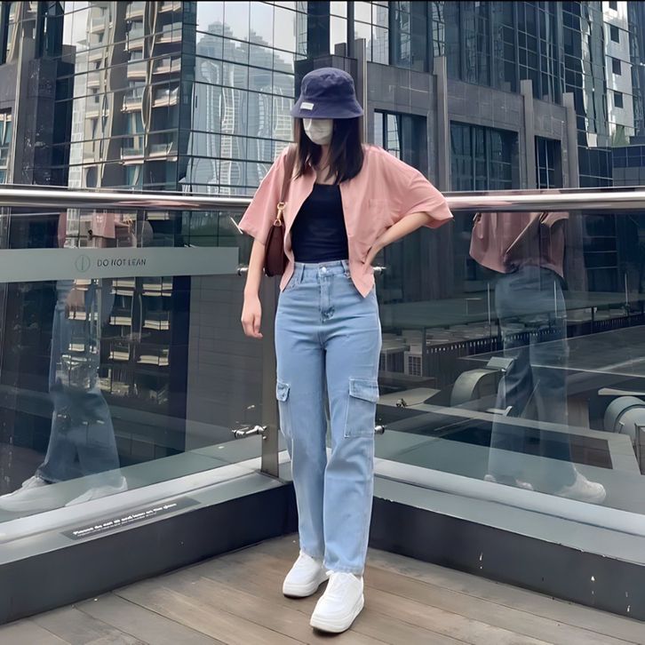 Celana Highwaist Cargo jeans Wanita Loose