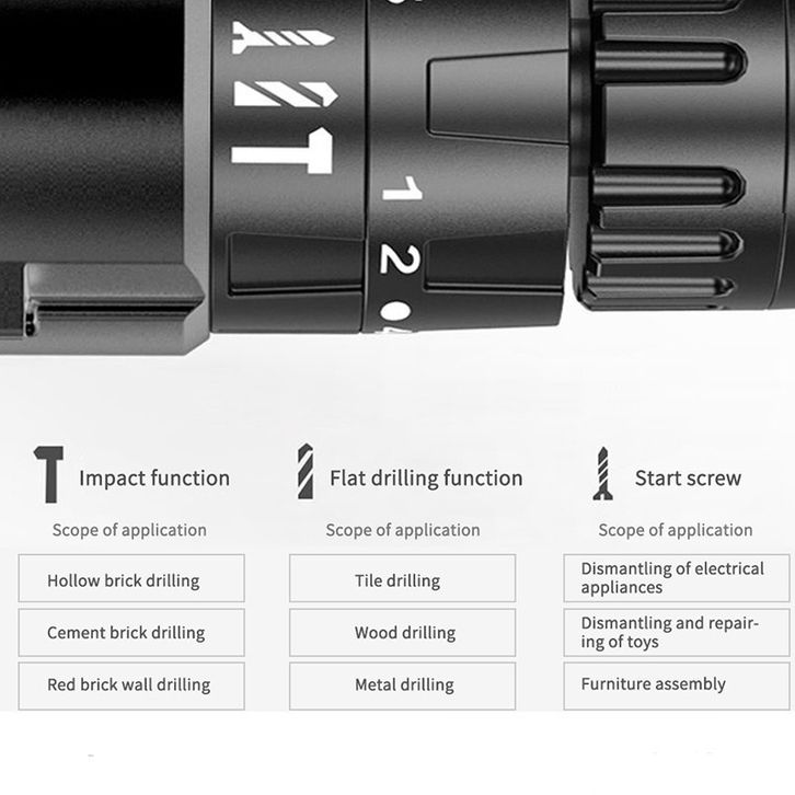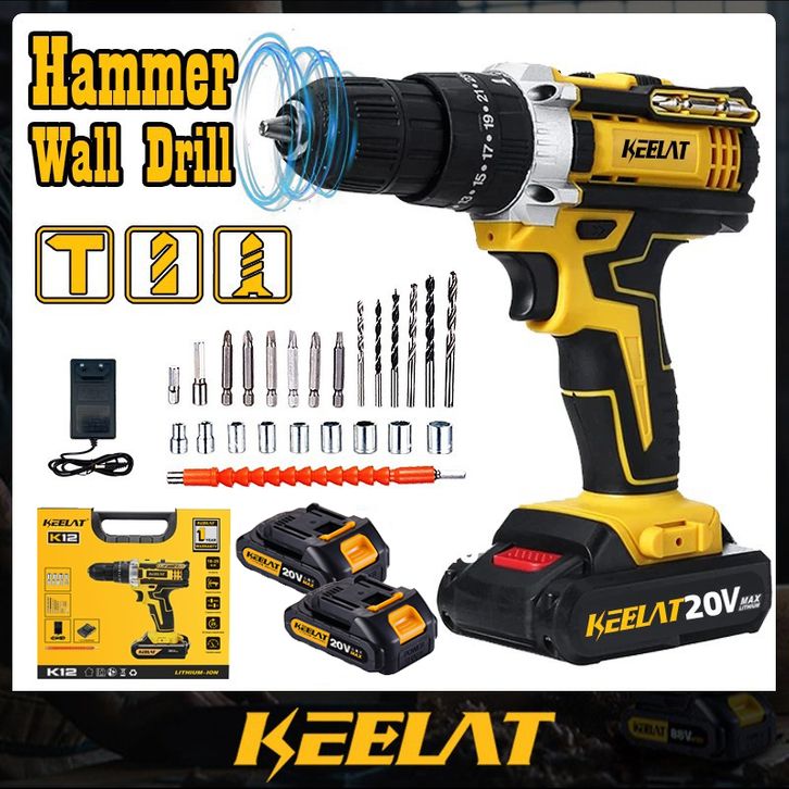 Mesin Bor 2Baterai Cordless Drill Impact Electric Battery Screwdriver Wall 3 Mode Screwdriver Hammer Drill Bits KEELAT