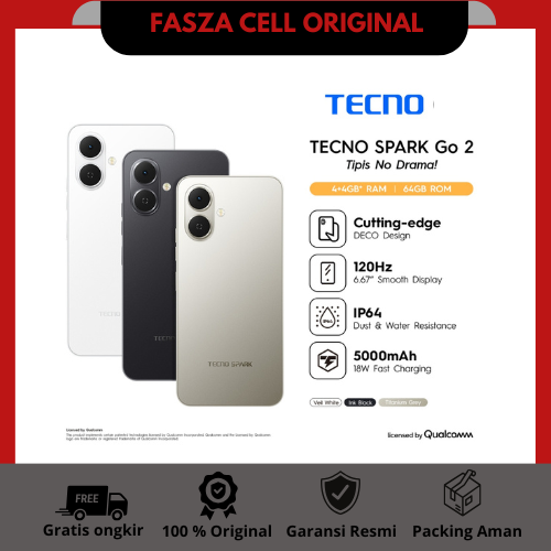 Handphone TECNO SPARK Go 2 4GB+4GB*/64GB, IP64, 6.67" HD+, 120Hz Smooth Display, 5000mAh, 18W Charging, Freelink Communi