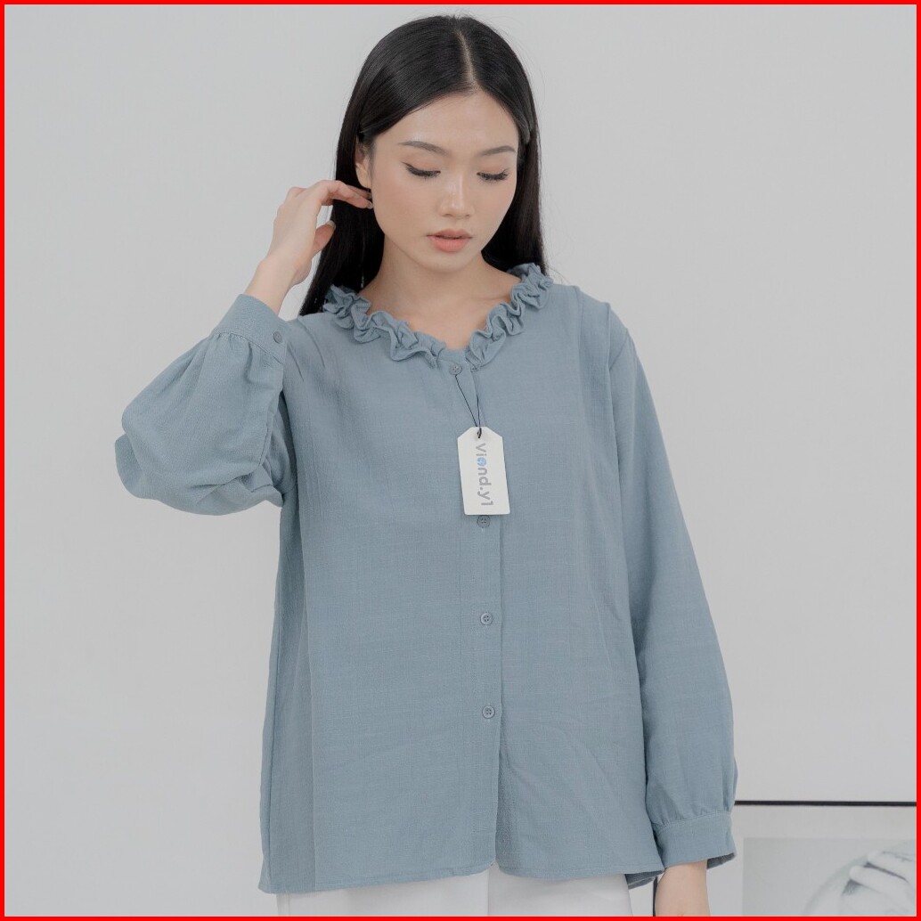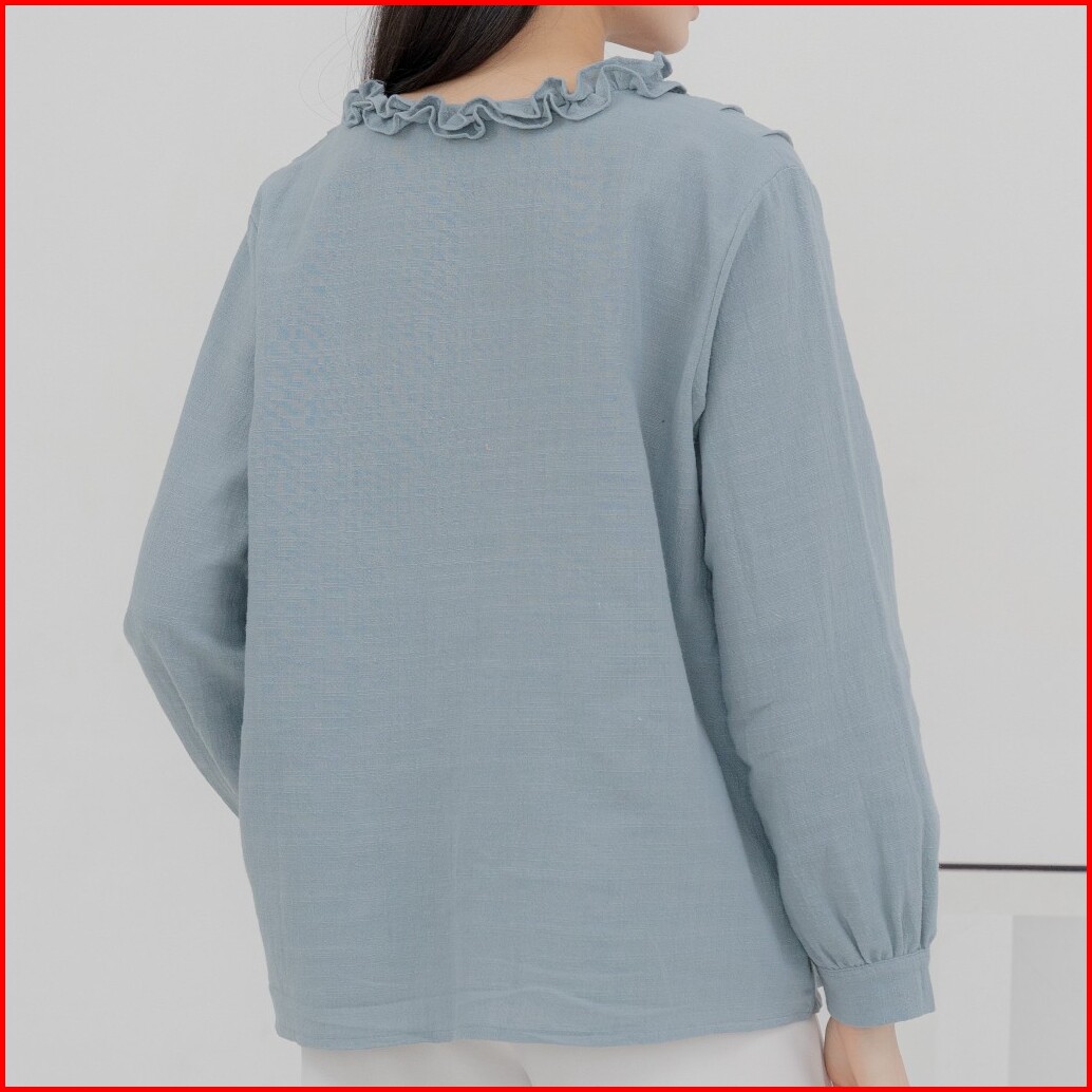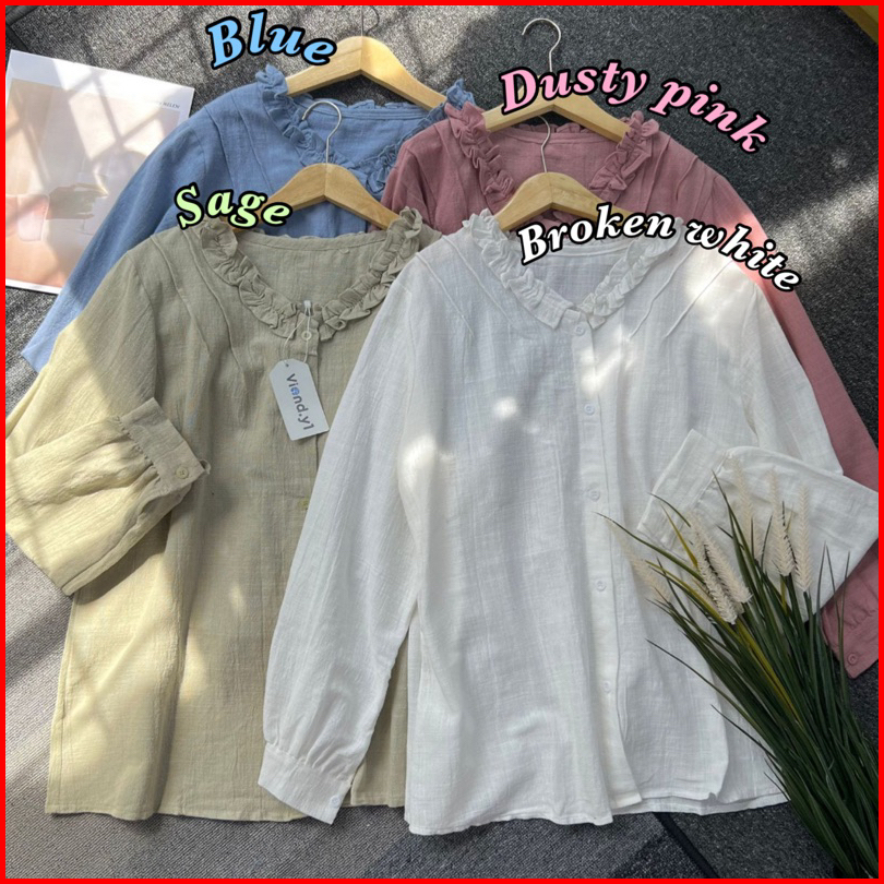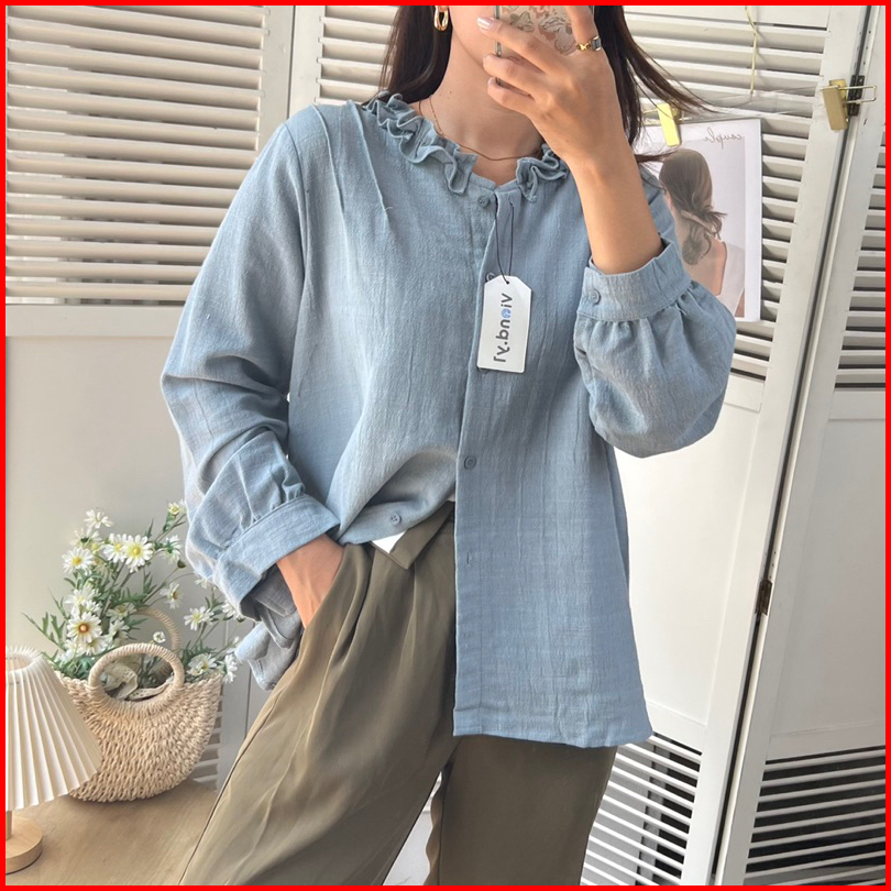Kemeja Ruffle Basic Blouse Linen Premium Wanita Korea Lengan Panjang E.59