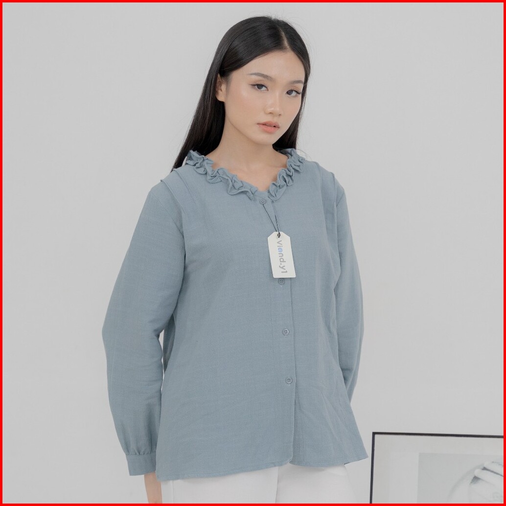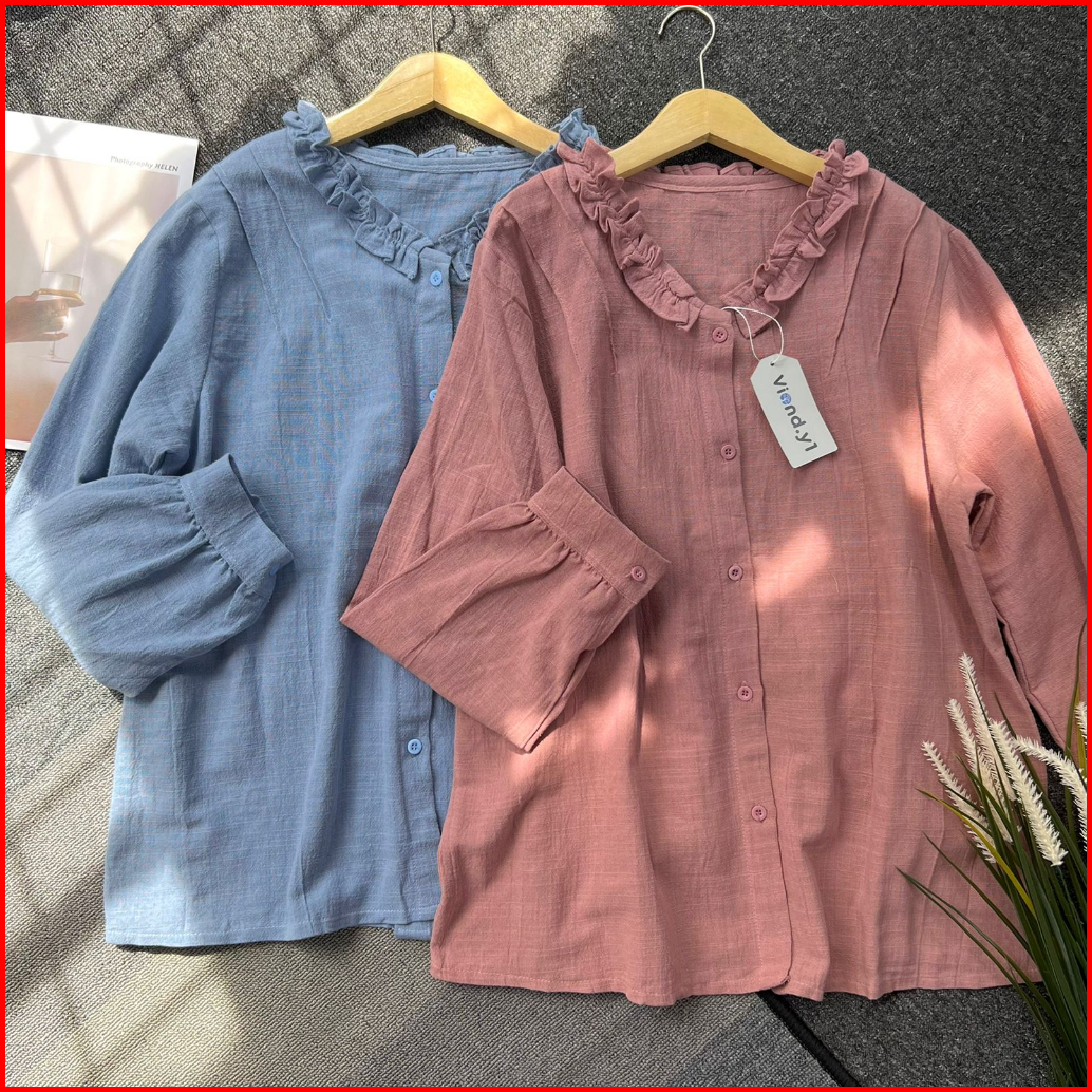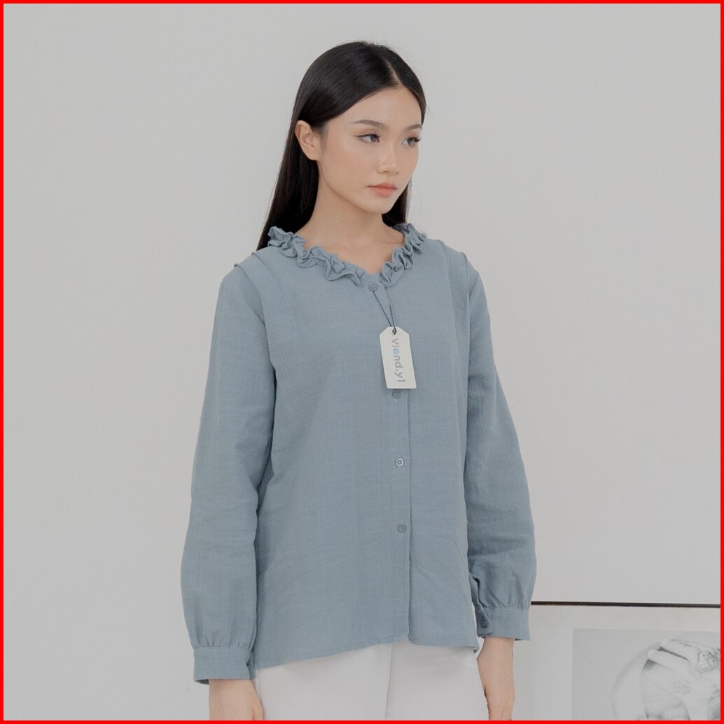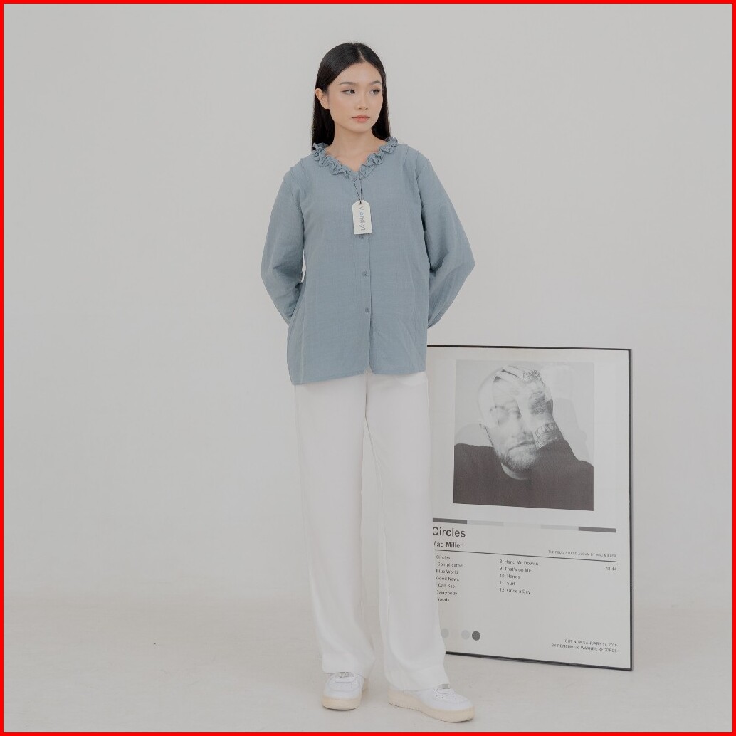 Kemeja Ruffle Basic Blouse Linen Premium Wanita Korea Lengan Panjang E.59