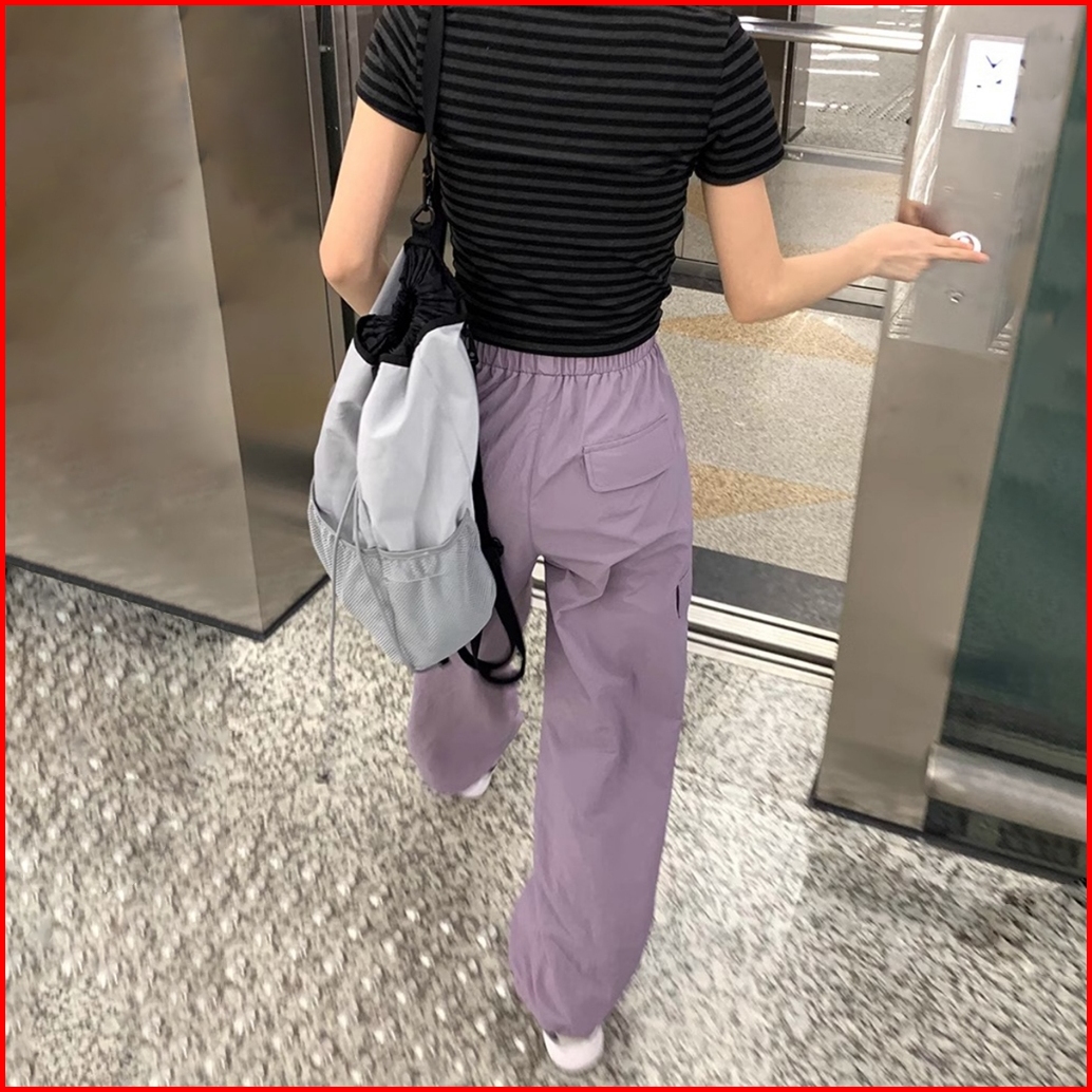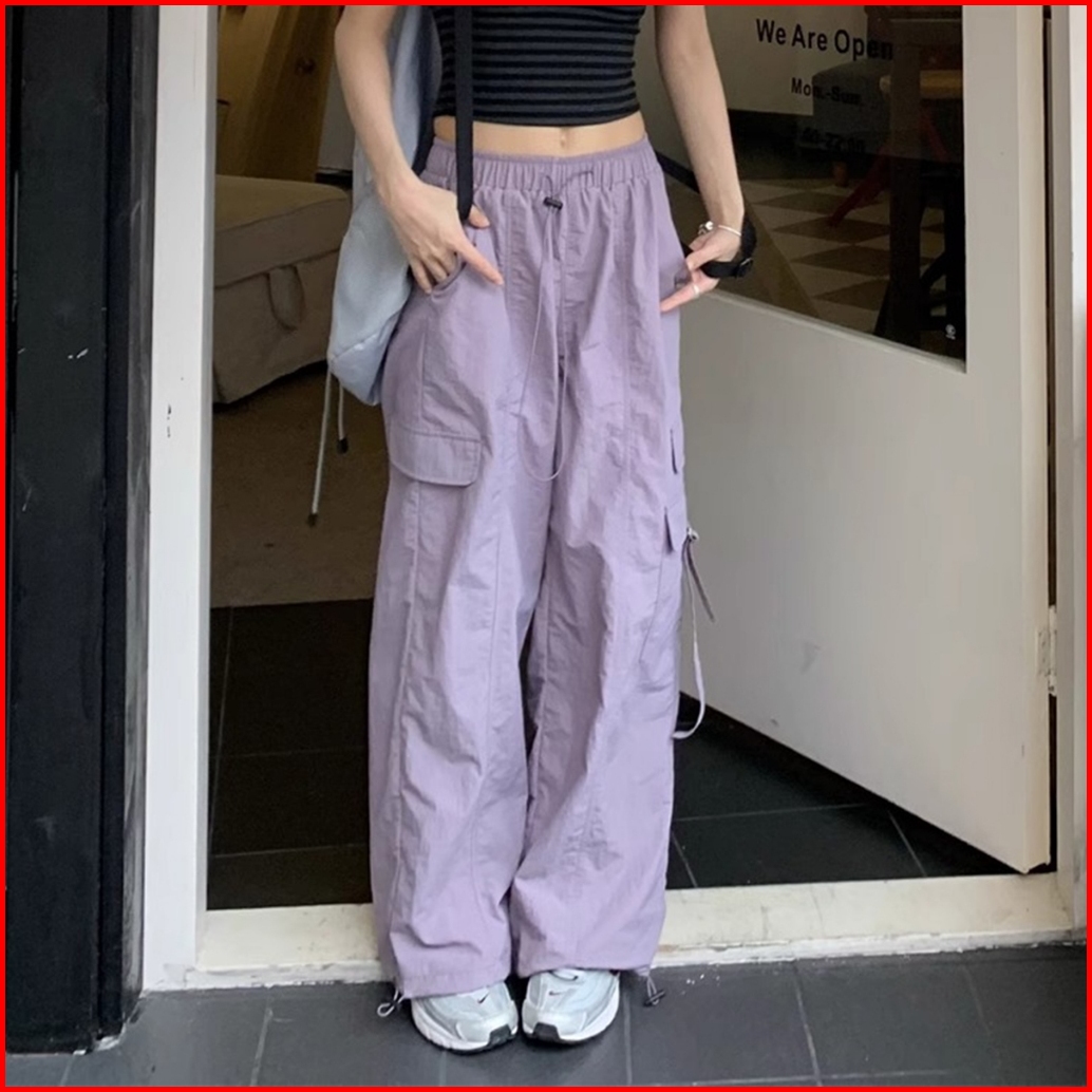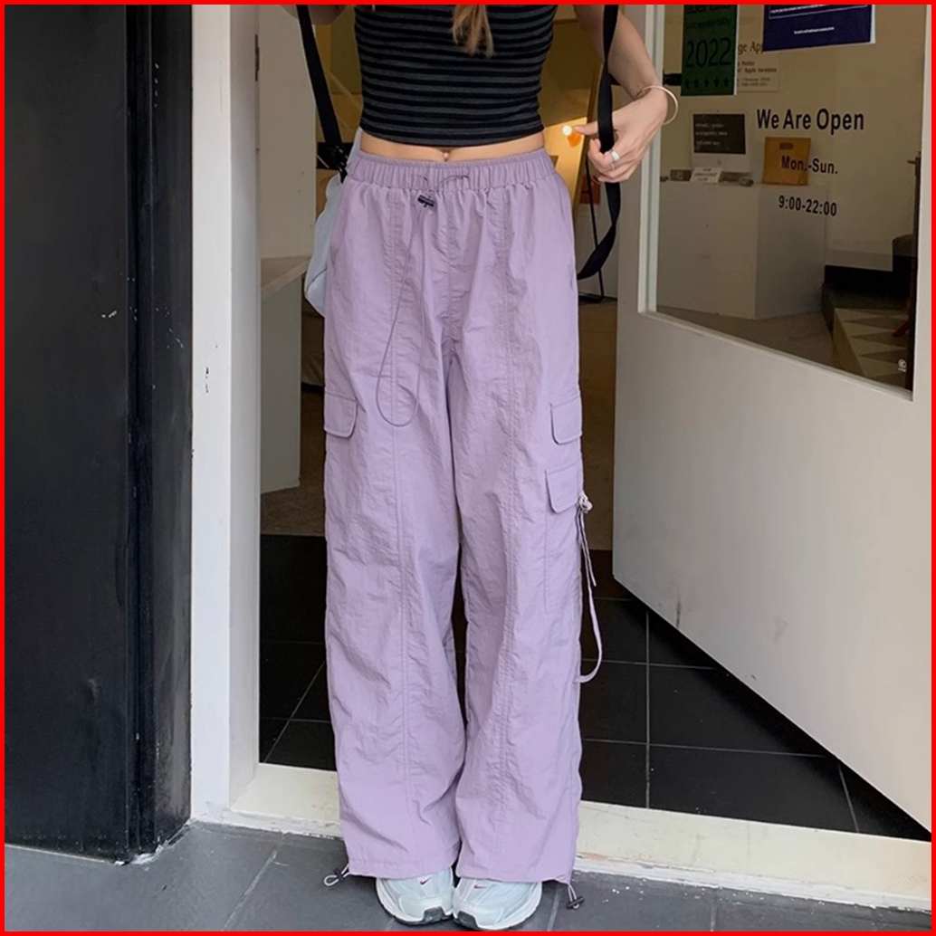 Gaya Pacar Cargo Celana Wanita Serut Lurus Longgar Pinggang Tinggi Korea Celana Olahraga Kasual