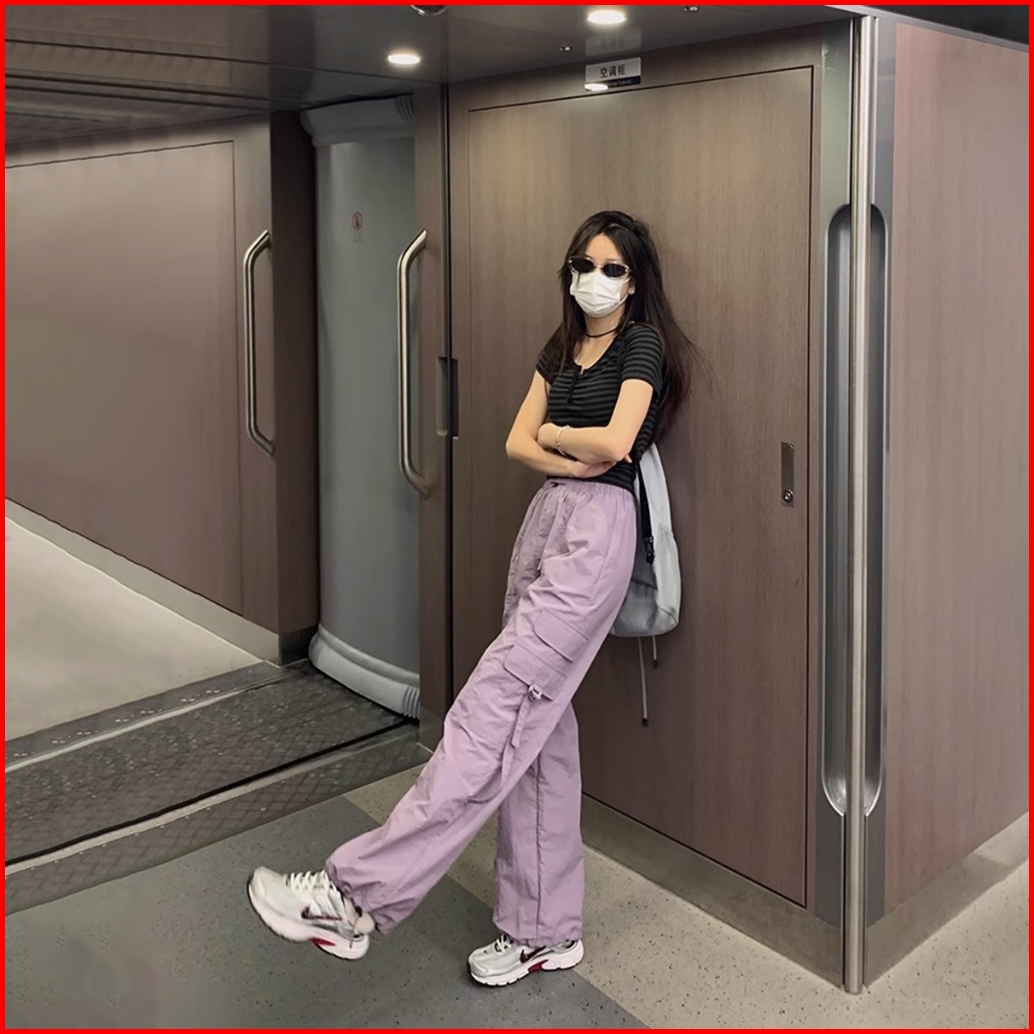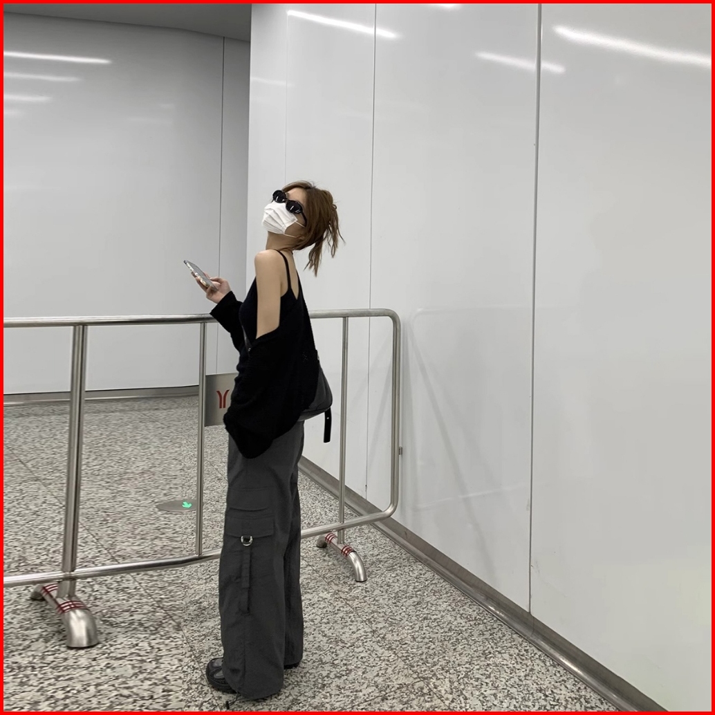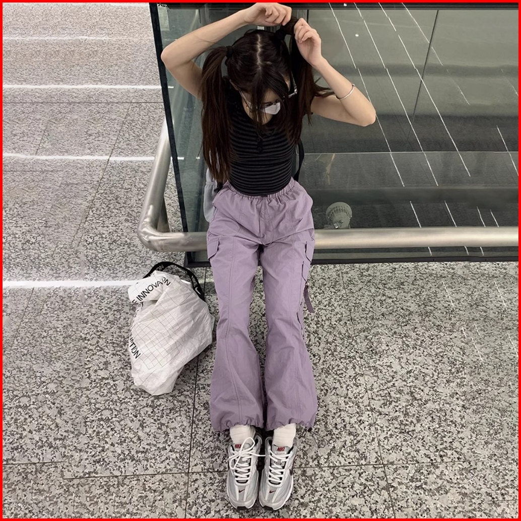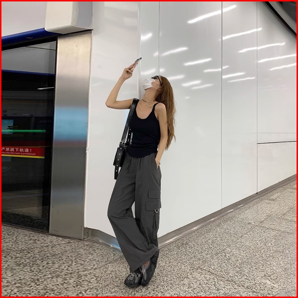 Gaya Pacar Cargo Celana Wanita Serut Lurus Longgar Pinggang Tinggi Korea Celana Olahraga Kasual