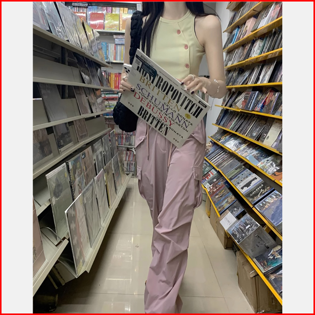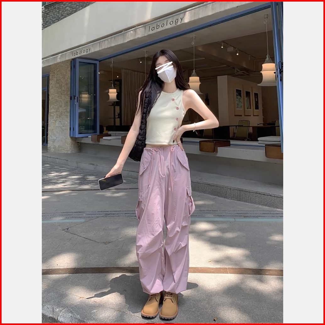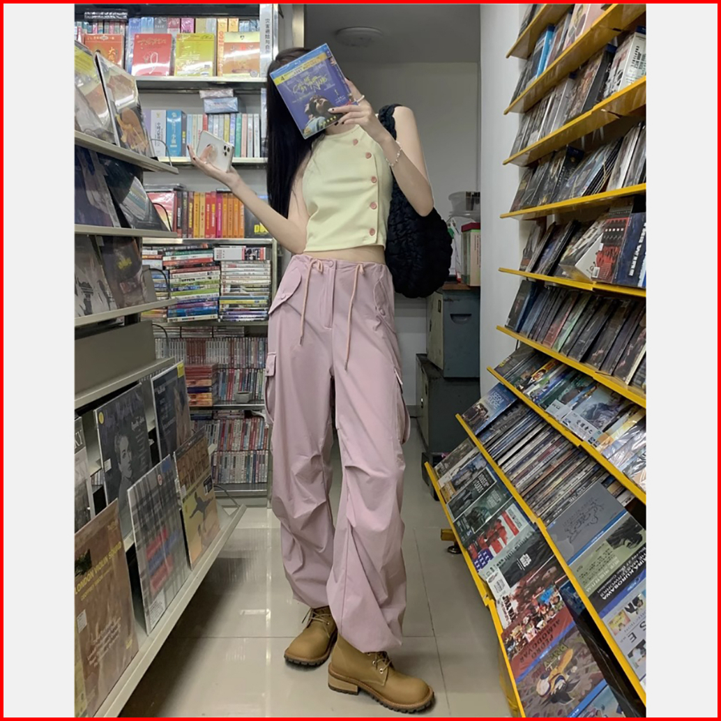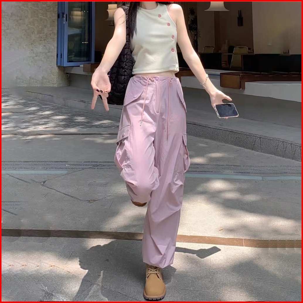 Celana Kargo Serut - Highwaist Loose Cargo - Celana Kargo Wanita - Celana Olahraga Longgar Tombol Merah Muda
