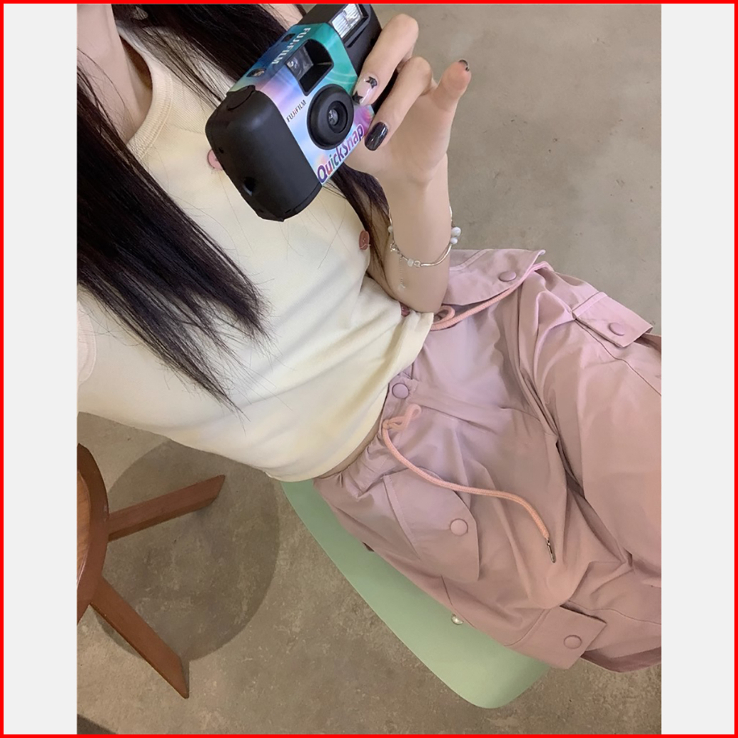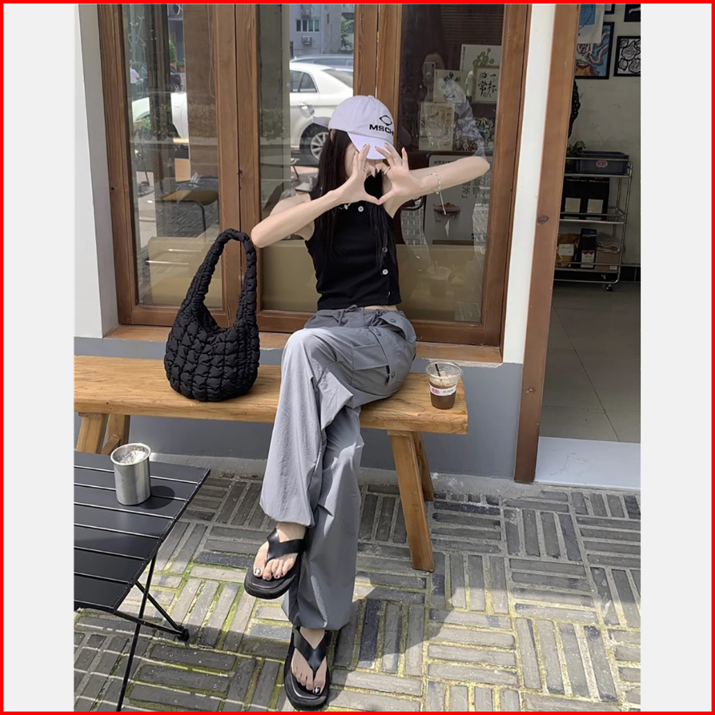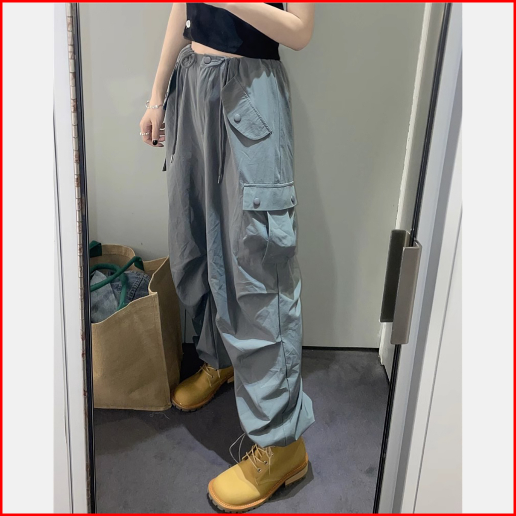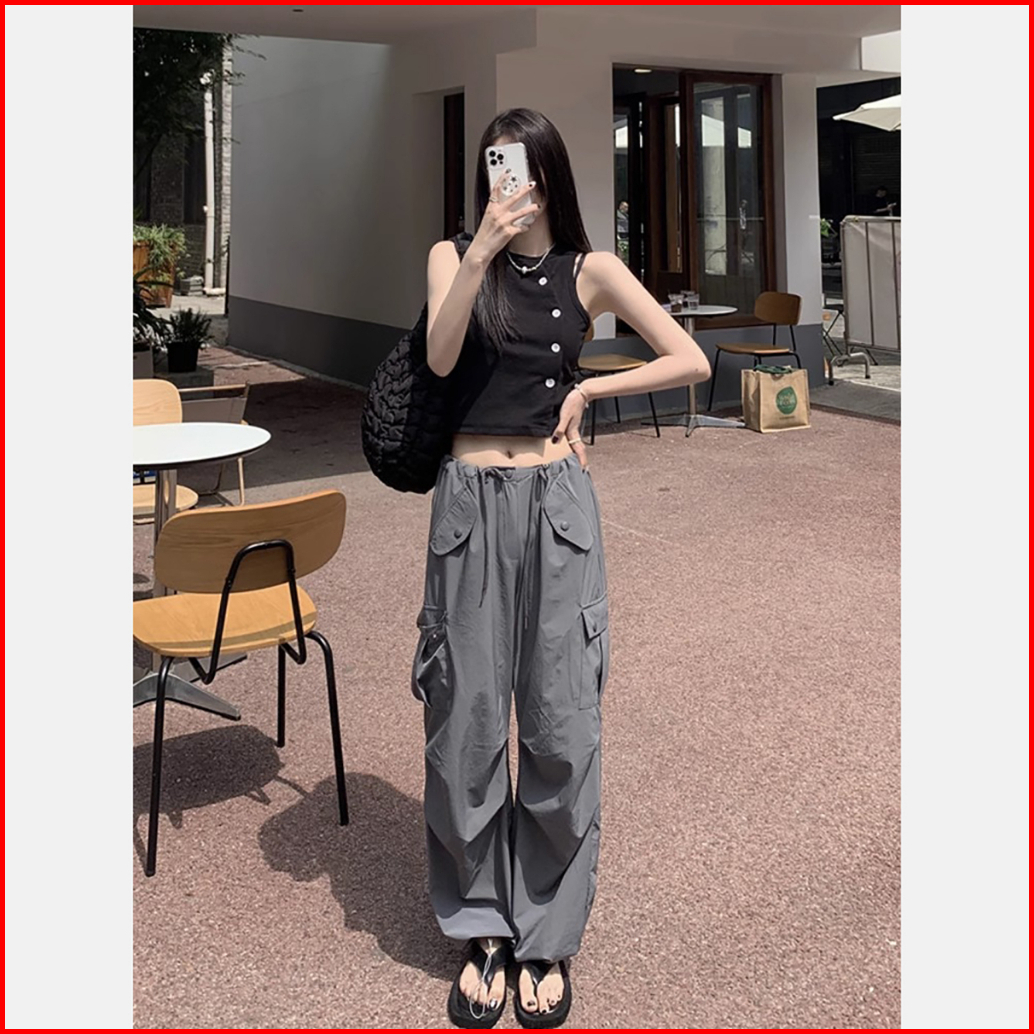 Celana Kargo Serut - Highwaist Loose Cargo - Celana Kargo Wanita - Celana Olahraga Longgar Tombol Merah Muda
