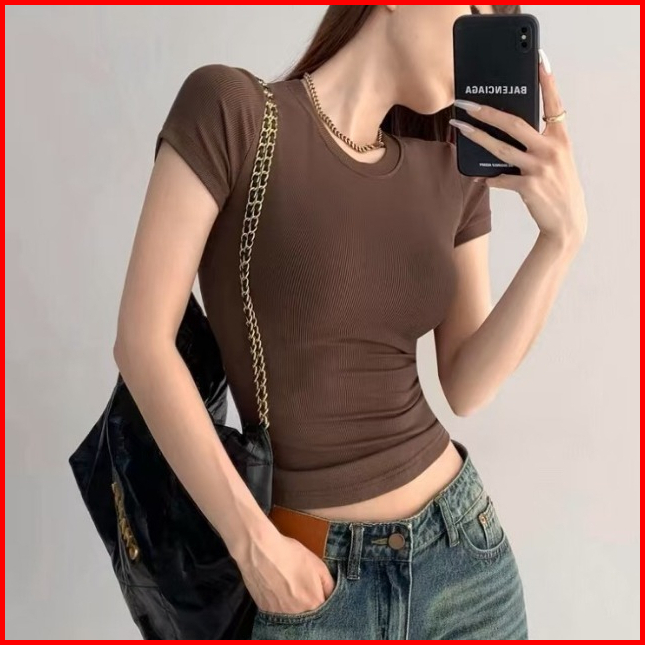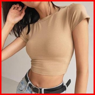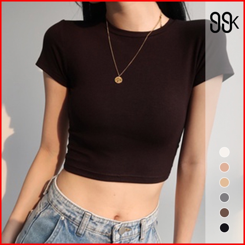 Premium99koutlet Atasan Cropped Wanita Short Sleeve Crew Neck Kaos Slim Fit Basic Tshirt Ribbed Polos S M L Xl 7302 T-sh