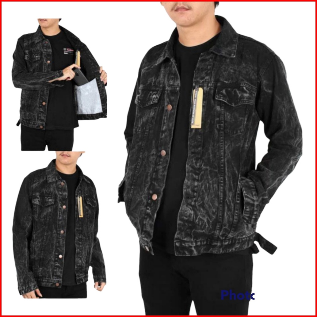 Jaket Jeans Denim Pria Jumbo Big Size Cowok Kekinian Snow Black Sandwash Hitam