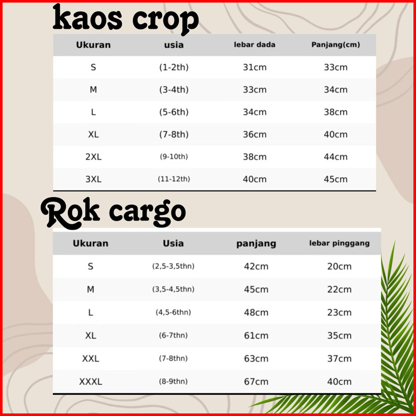 1-2 tahun (S), 3-4 tahun (M), 4-5 tahun (L), 5-6 tahun (XL), 7-8tahun (2xl), 8-9tahun (3XL), 10 tahun, 11 tahun, 12 tahun
