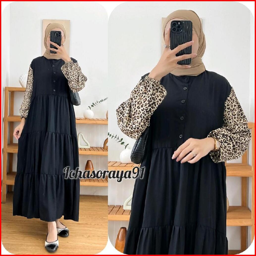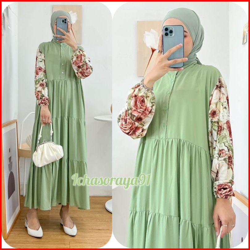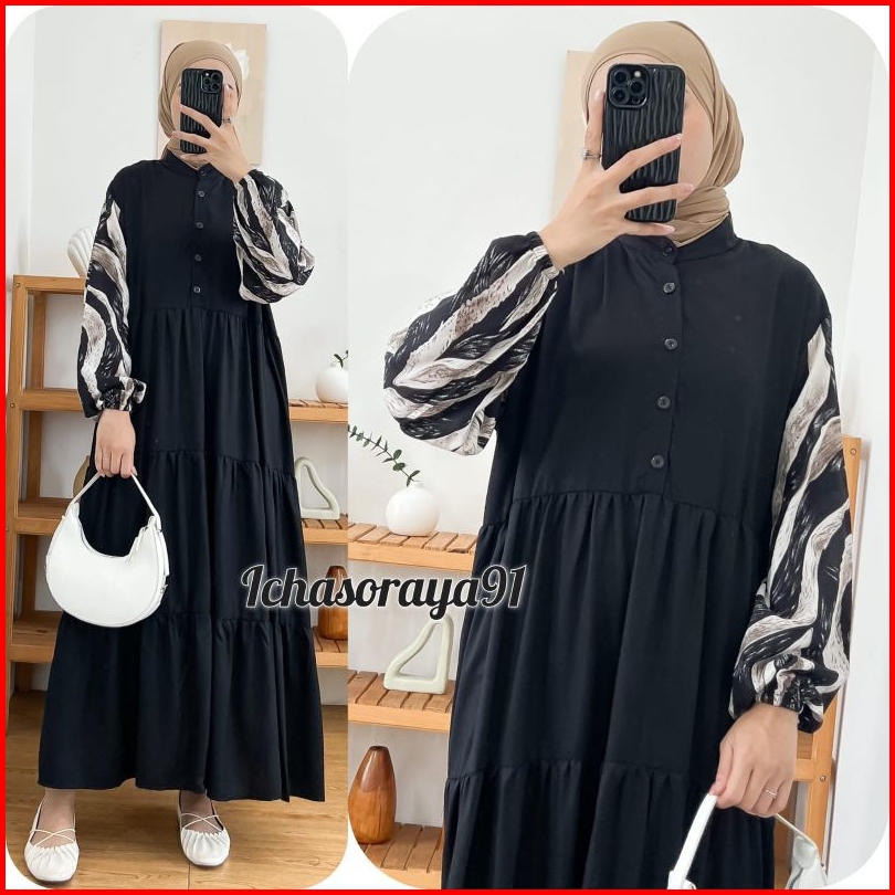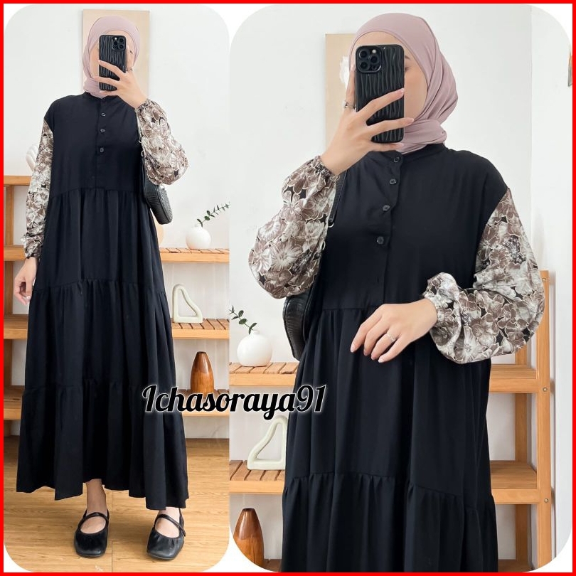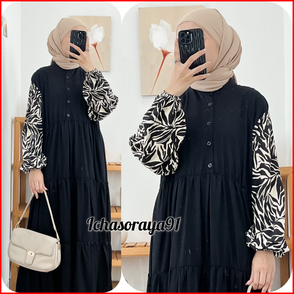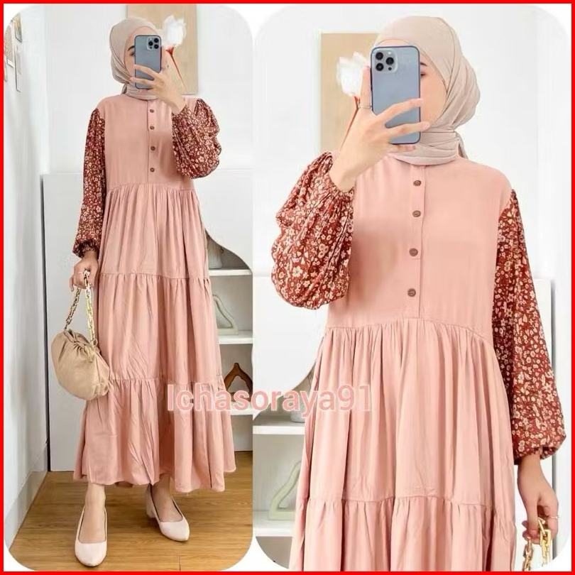 Midi Dress Kombinasi Bahan Rayon Twill Busui Kancing Depan Akitf