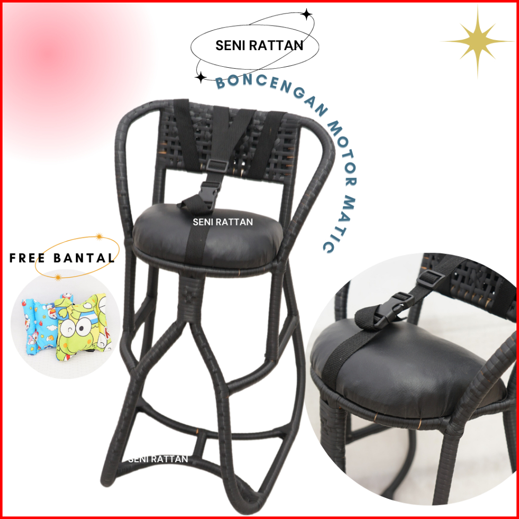 Boncengan Anak Motor Matic Anyaman Rotan Sintetis Full Black Hitam Plus Bantal Stang Dan Sabuk Pengaman