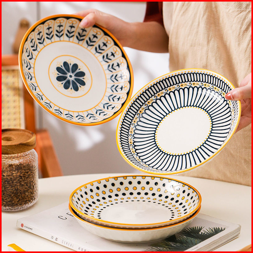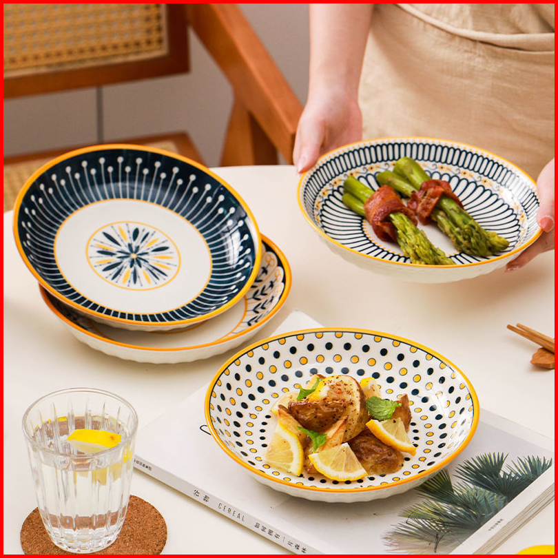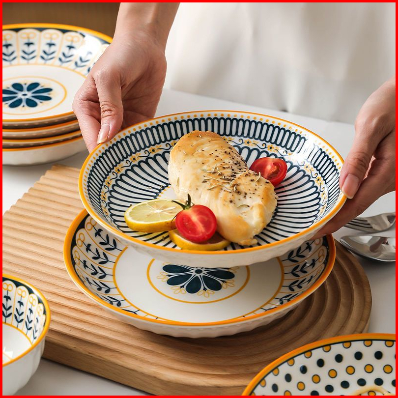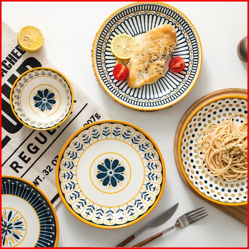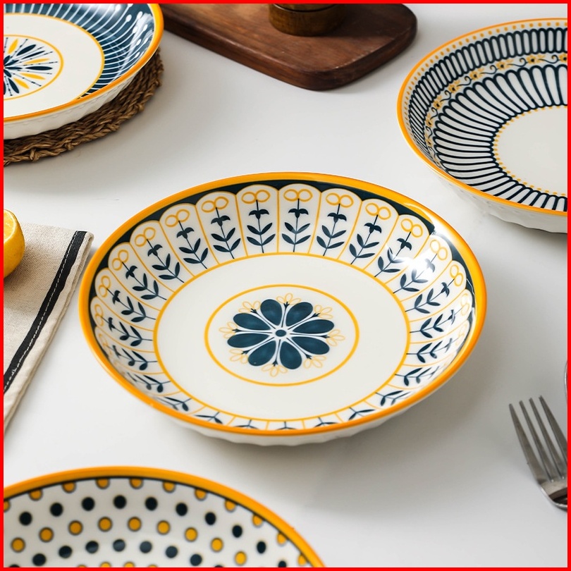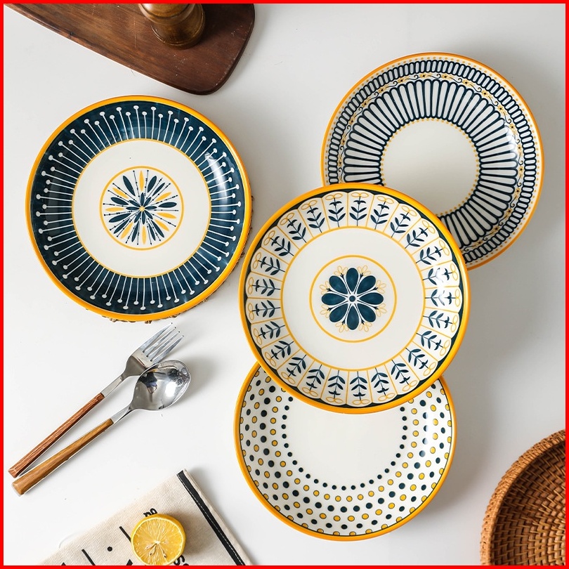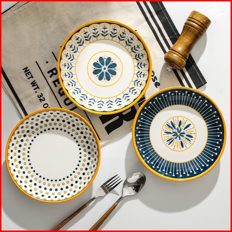 Ashome Piring Keramik Makan Blue Flower Collection Tahan Panas Dan Microwave Safe Ukuran 20 Cm Piring Saji Keramik Elega