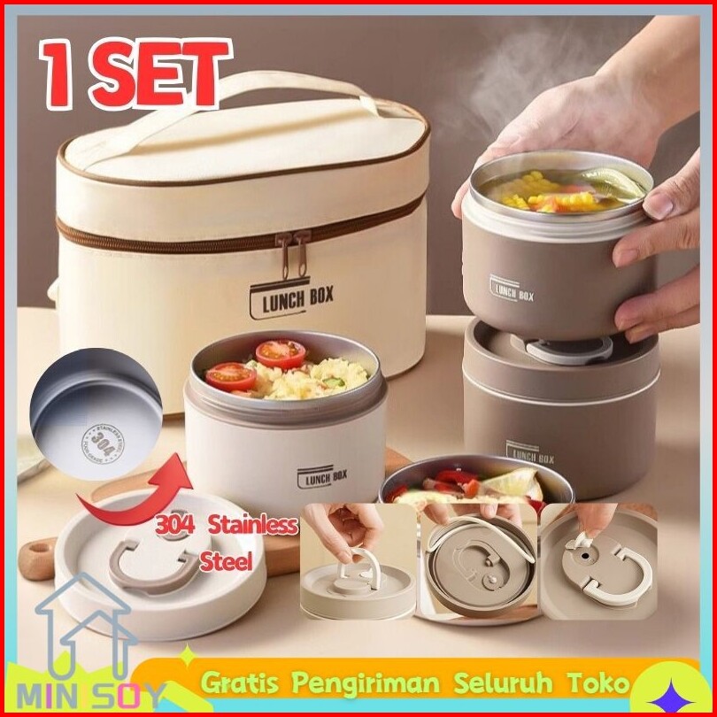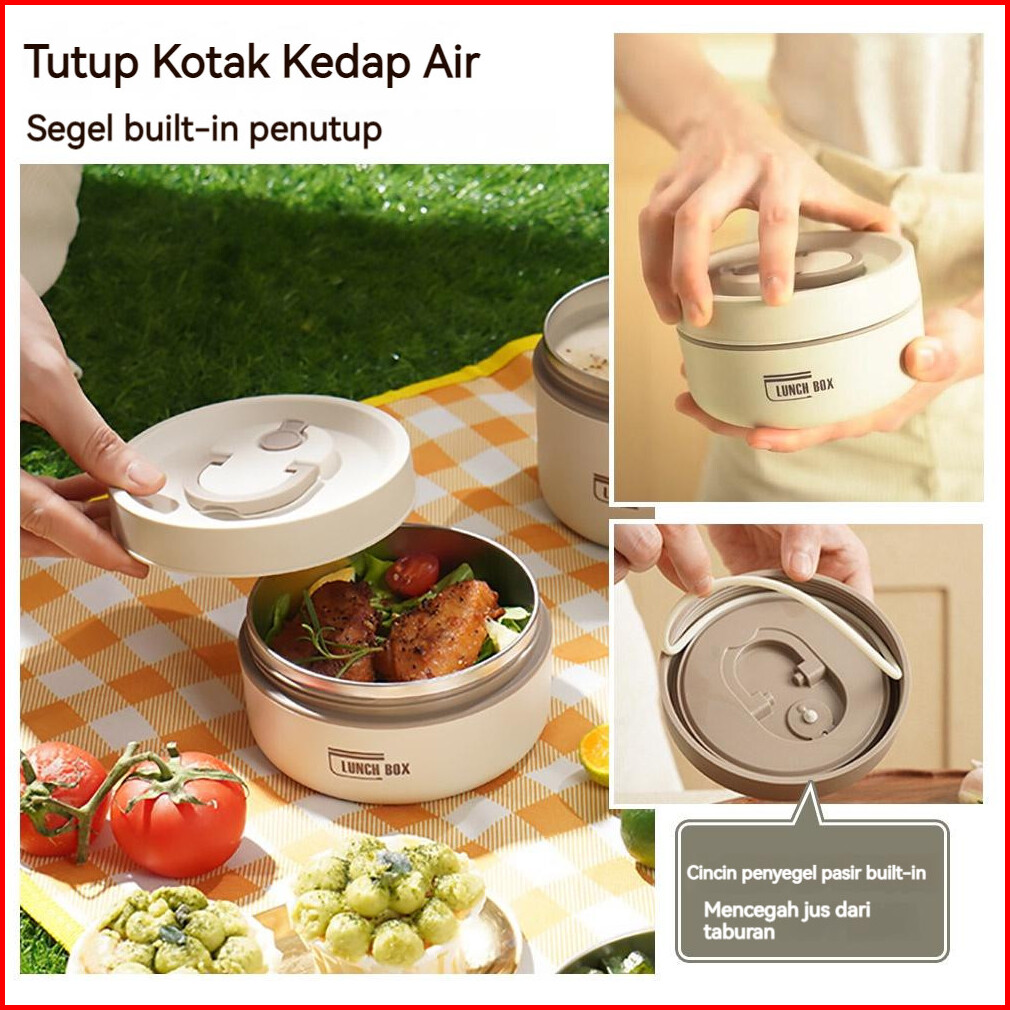 Ready Stock 1set 304 Kotak Makan Siang Bento Portabel Tahan Bocor Gaya Jepang Round Stainless Lunch Box Cream Rice Conta