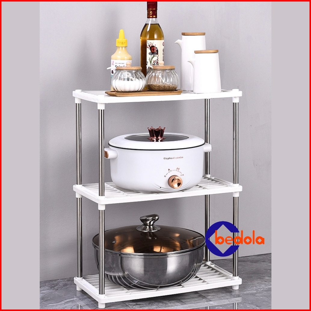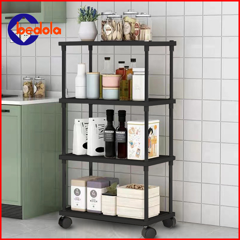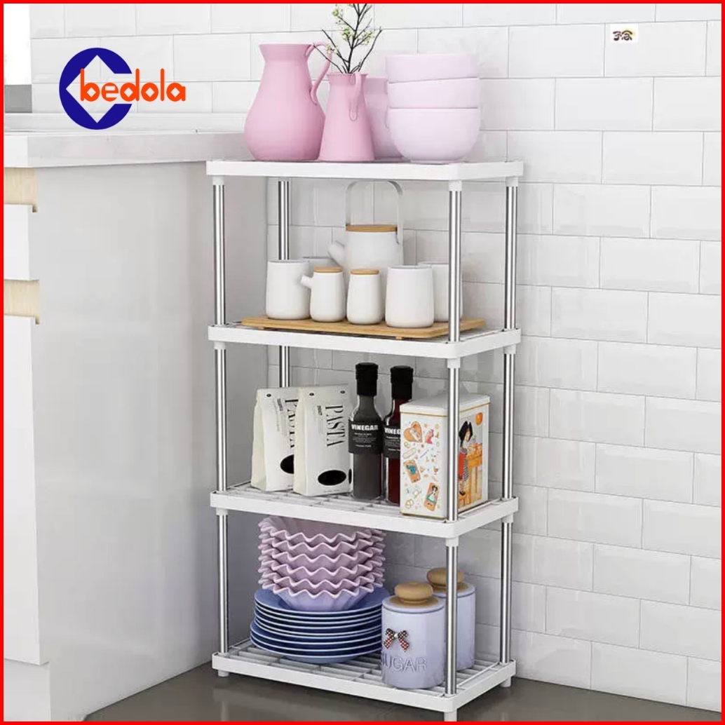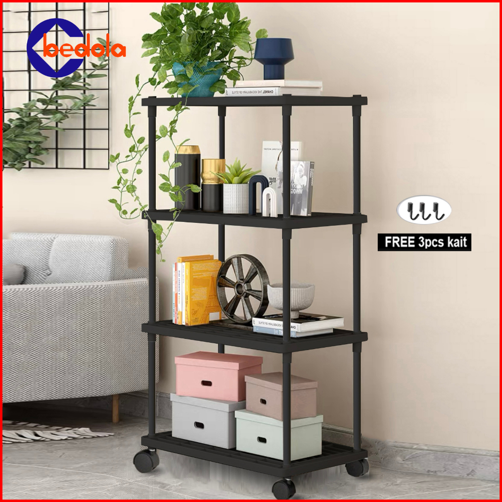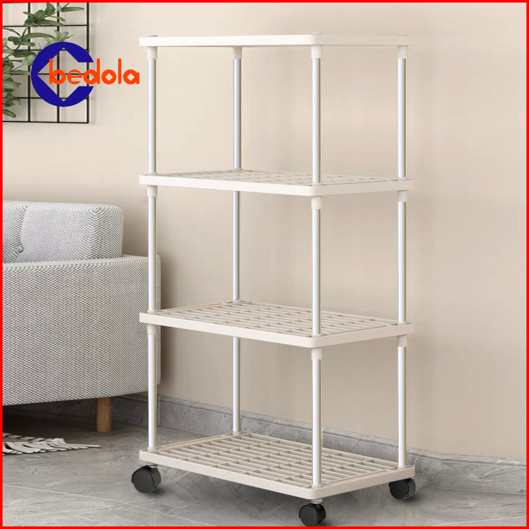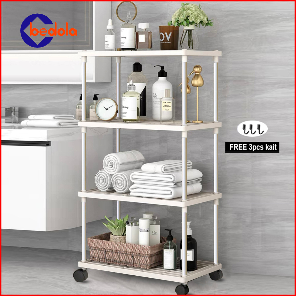 Rak Dapur Plastik Acsthetic Rak Susun Rak Serbaguna Rak Panci Putih 4 Layer Dengan Roda Free 3 Kait