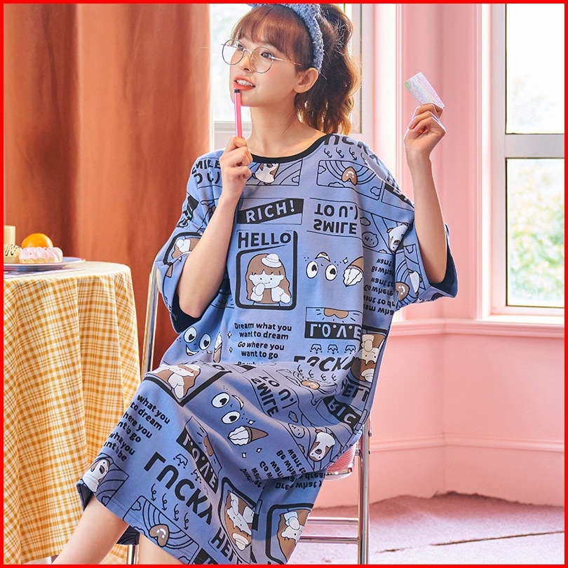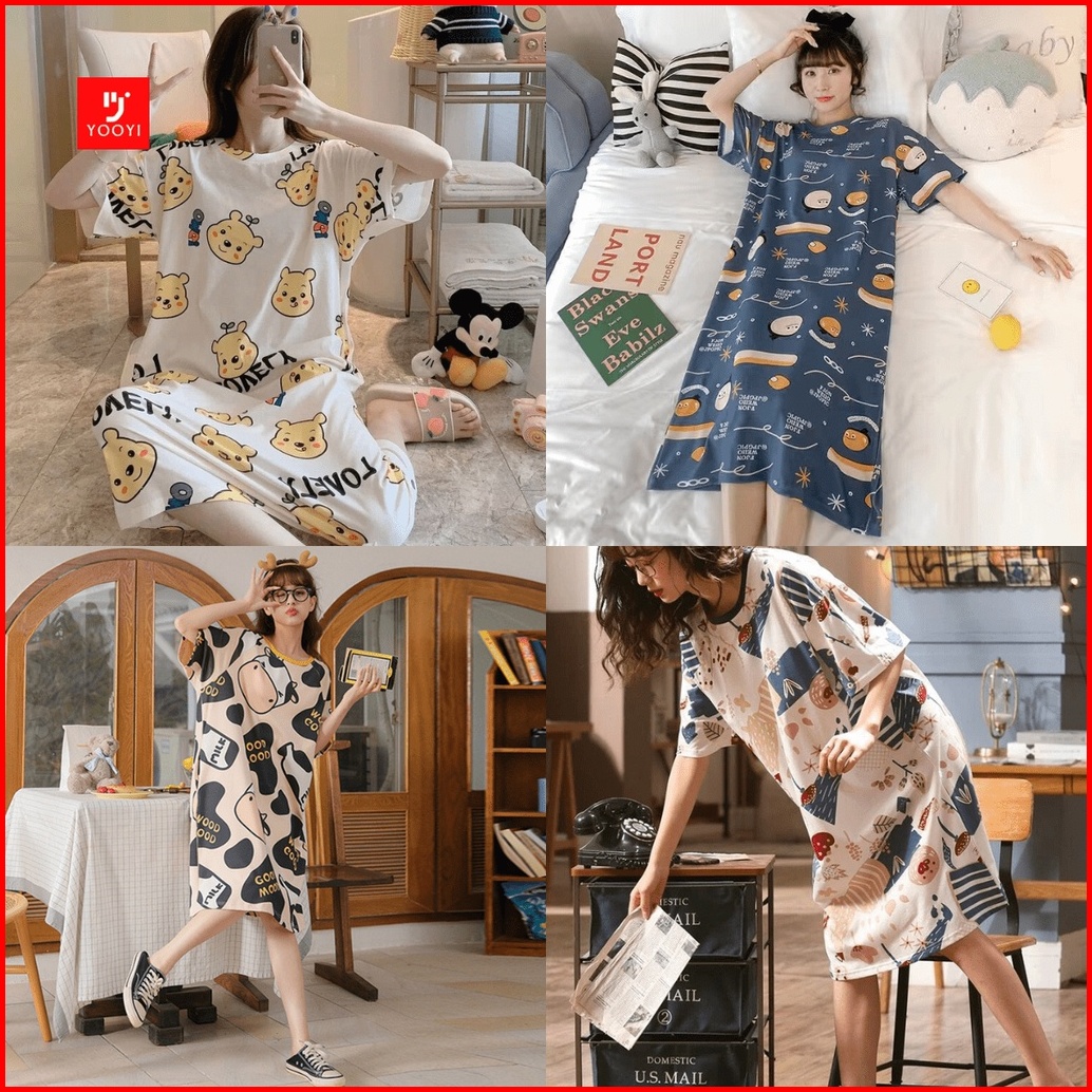 Yooyi Baju Tidur Wanita Daster Dewasa Motif Gaun Malam Piyama Kaos Fashion Perempuan Remaja Murah Kekinian Lengan Pendek