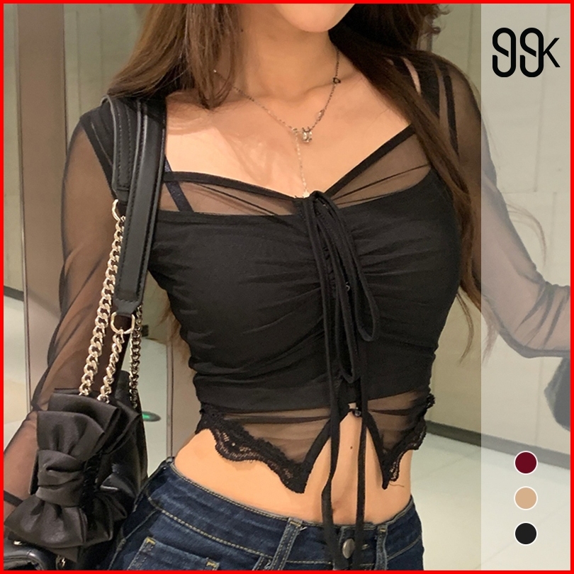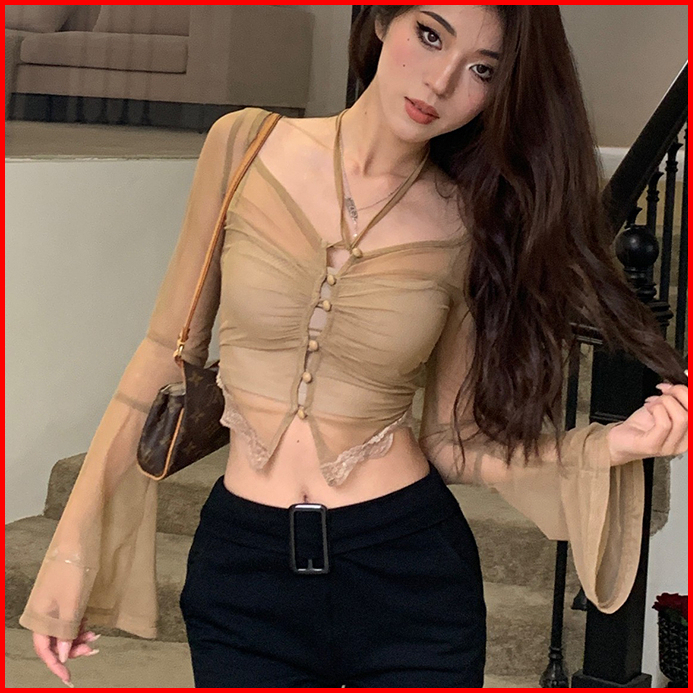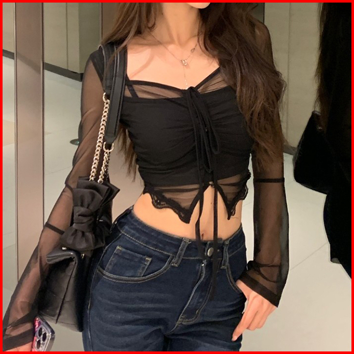 Long Sleeve Blouse Crop Top With Neckline 2852