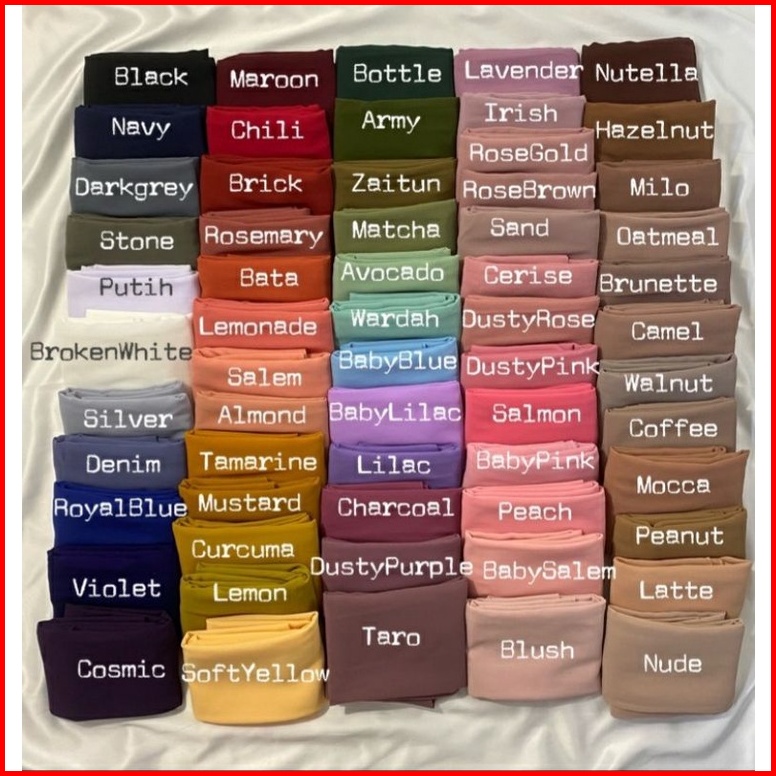 Black, White, Broken white, Dark grey, Silver, Navy, Denim, Maroon, Brick, Rosemary, Bata, Stone, Salem, Chili, Mustard, Lemon, Bottle, Zaitun, Matcha, Avocado, Wardah, Babyblue, Baby lilac, Lilac, Dusty purple, Lavender, Irish, Rosegold, Rosebrown, Cerise, Camel, Dusty rose, Dusty Pink, Salmon, Baby pink, Peach, Babysalem, Blush, Nude, Royal blue, Peanut, Mocca, Walnut, Brunate, Coffe, Nutella, Oatmeal, Milo, Hazelnut, Latte, Army