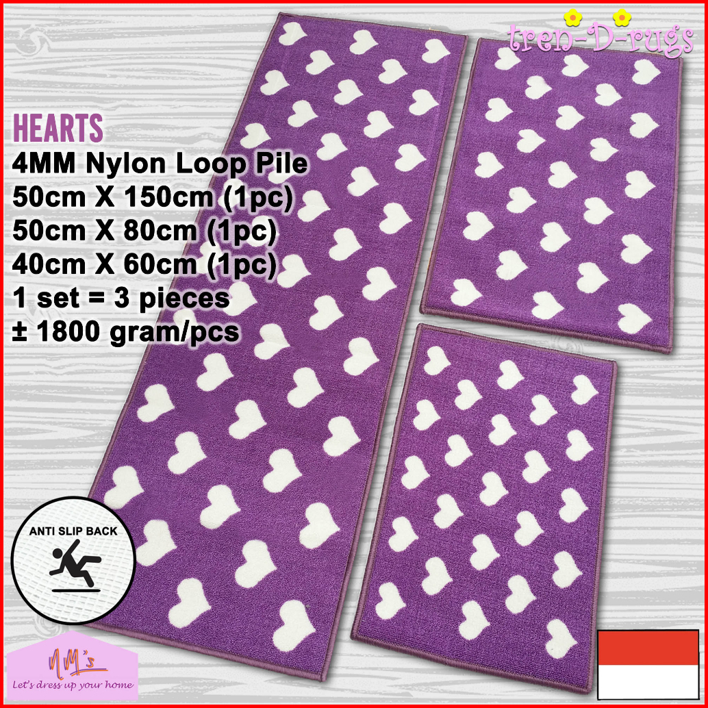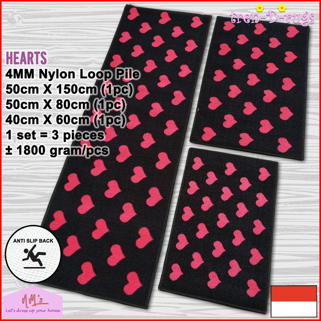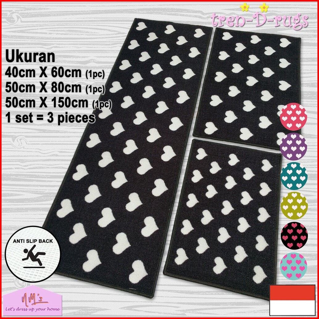 Tren-d-rugs Keset Kaki Love Dapur Panjang Lorong Bulu Anti Slip Murah Kitchen Mat 1 Set 3pcs - Nms