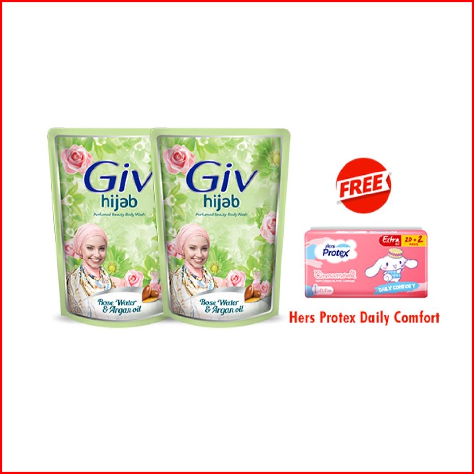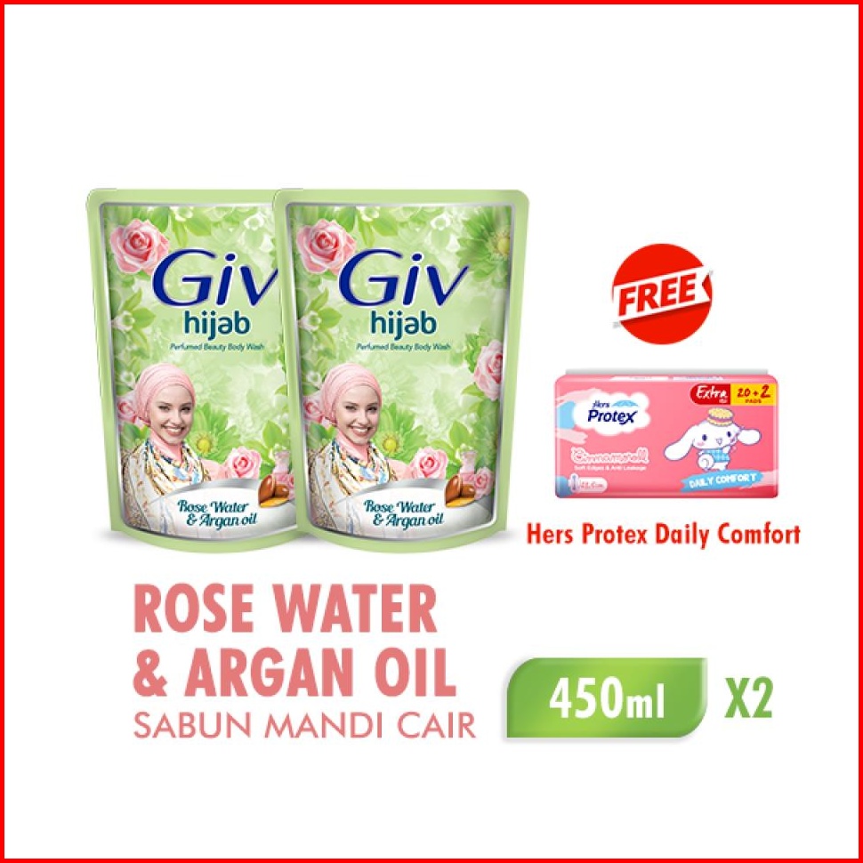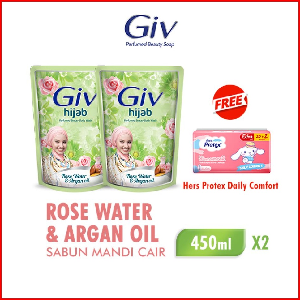 Bodywash Giv White Hijab Rose Water Argan Oil Pouch 400ml X2 Free Protex Daily Comfort Day Bag 22