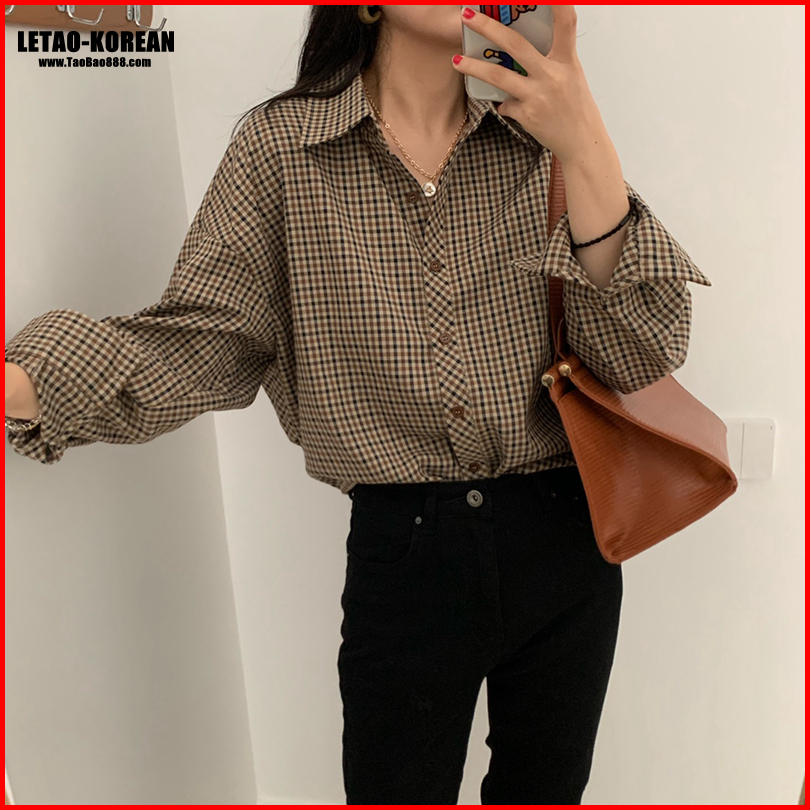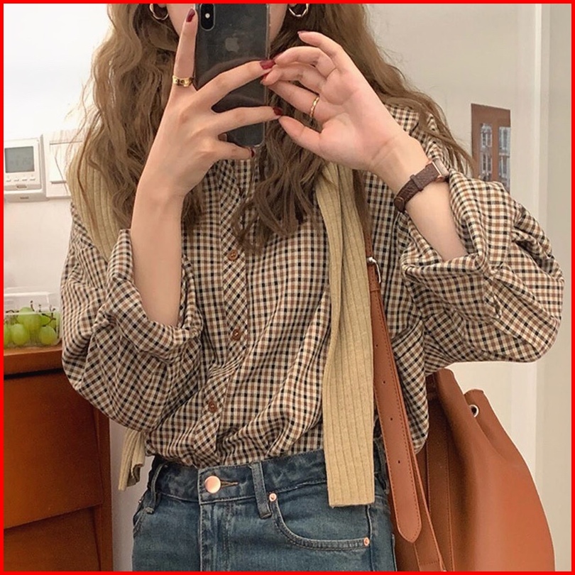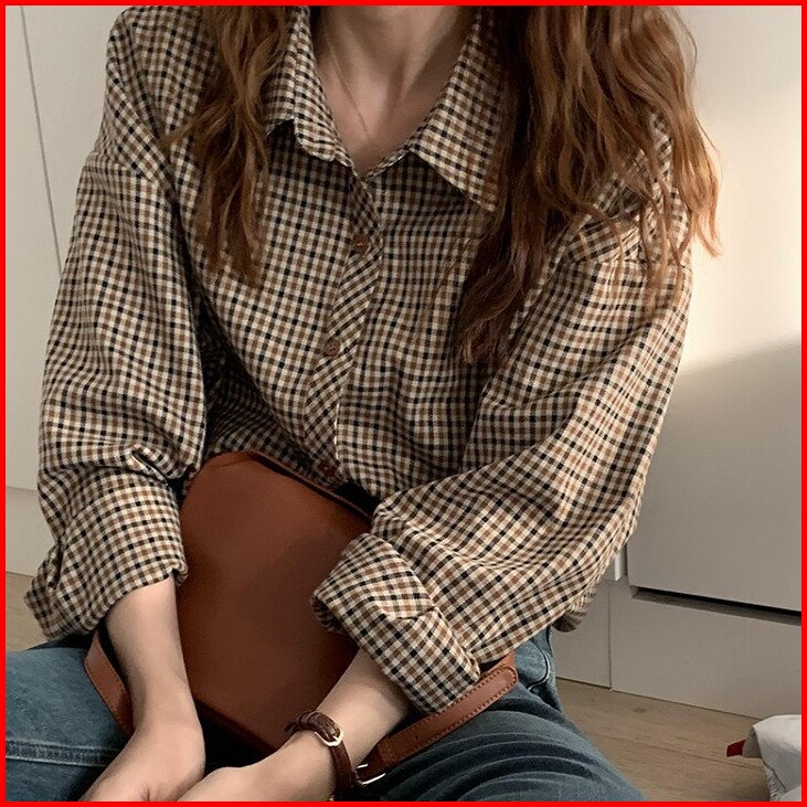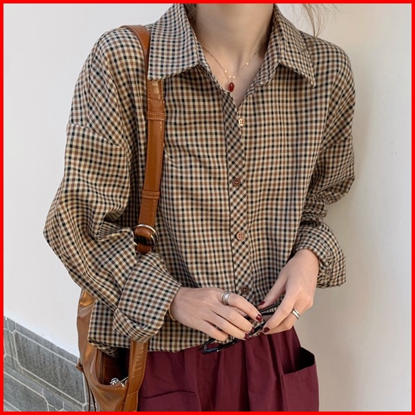 Yikoo-oversize Kemeja Shirt Atasan Kotak-kotak Wanita Retro Top Big Size