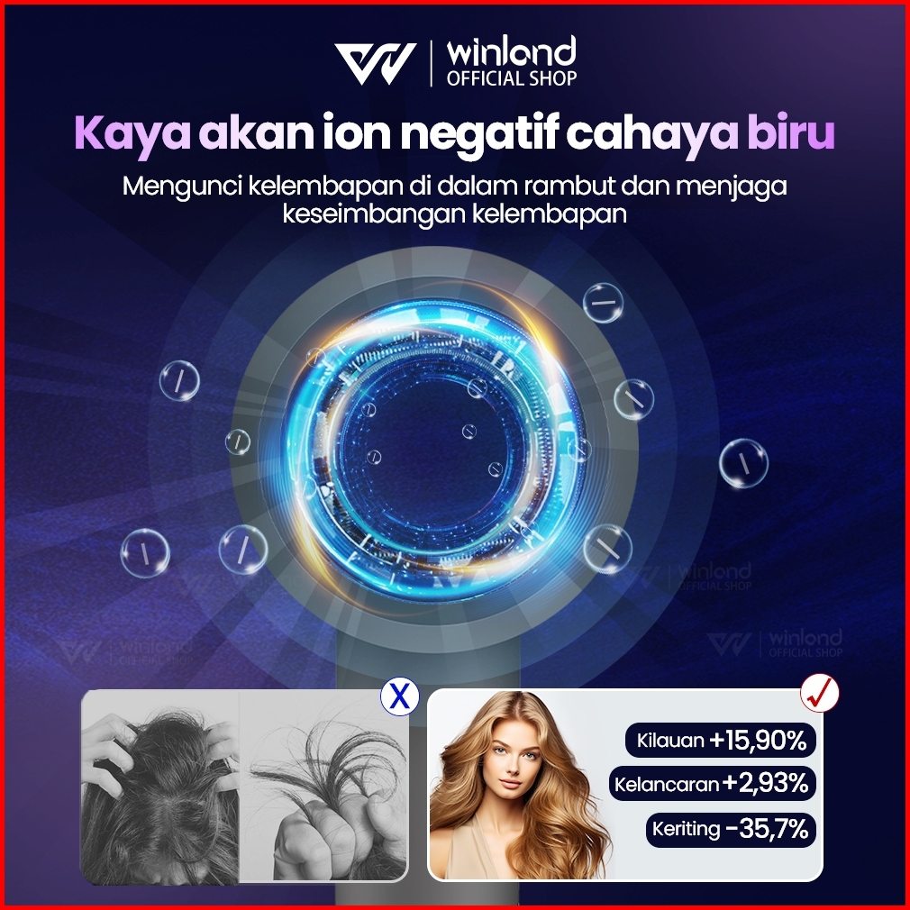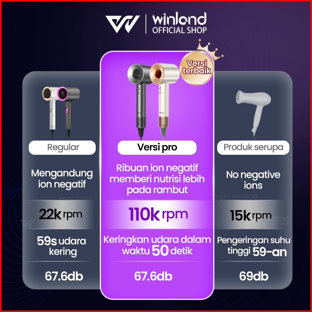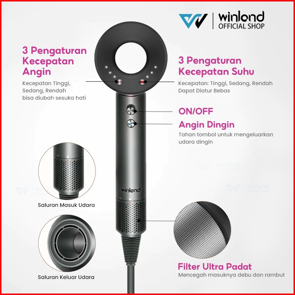Winland High Speed Hairdryer Rambut Pengering Professional Negative Ion Portable Hair Protection 150000 Rpm Blower Stron