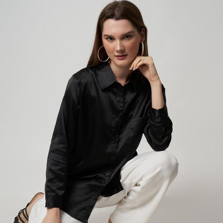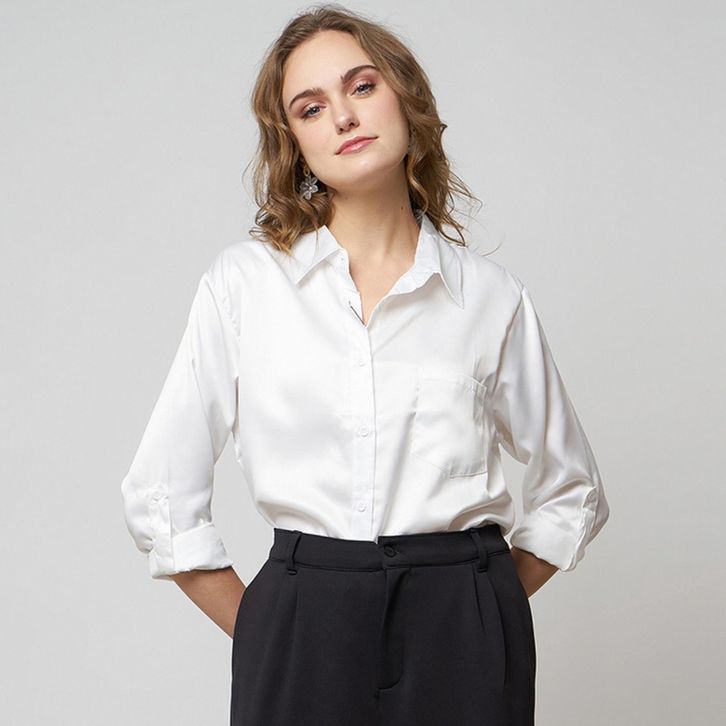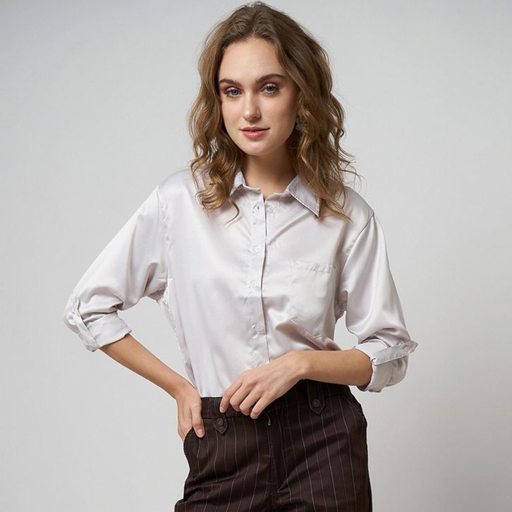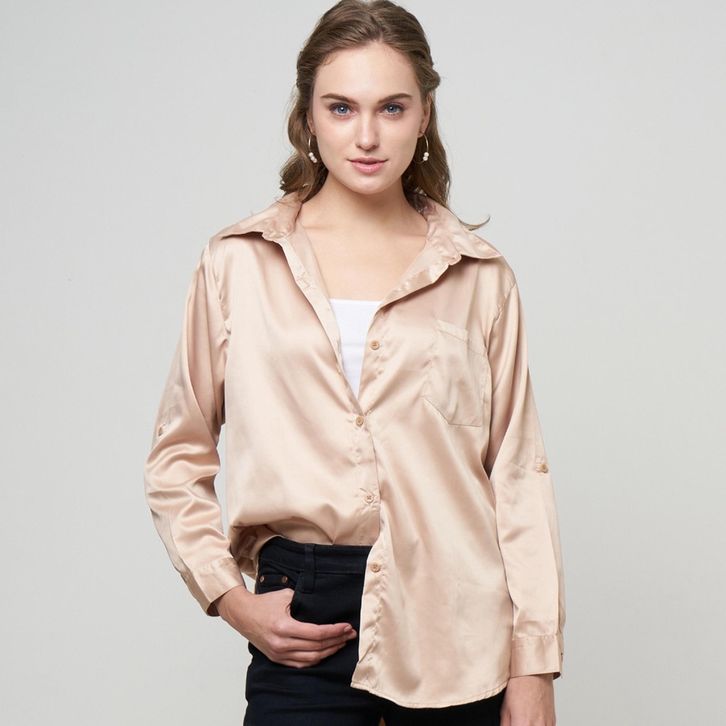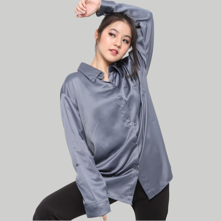 Kemeja Oversize Cewek Lengan Panjang Satin Atasan Baju Hem Cewek Kerja Casual Formal Pesta Satin Velvet Size L