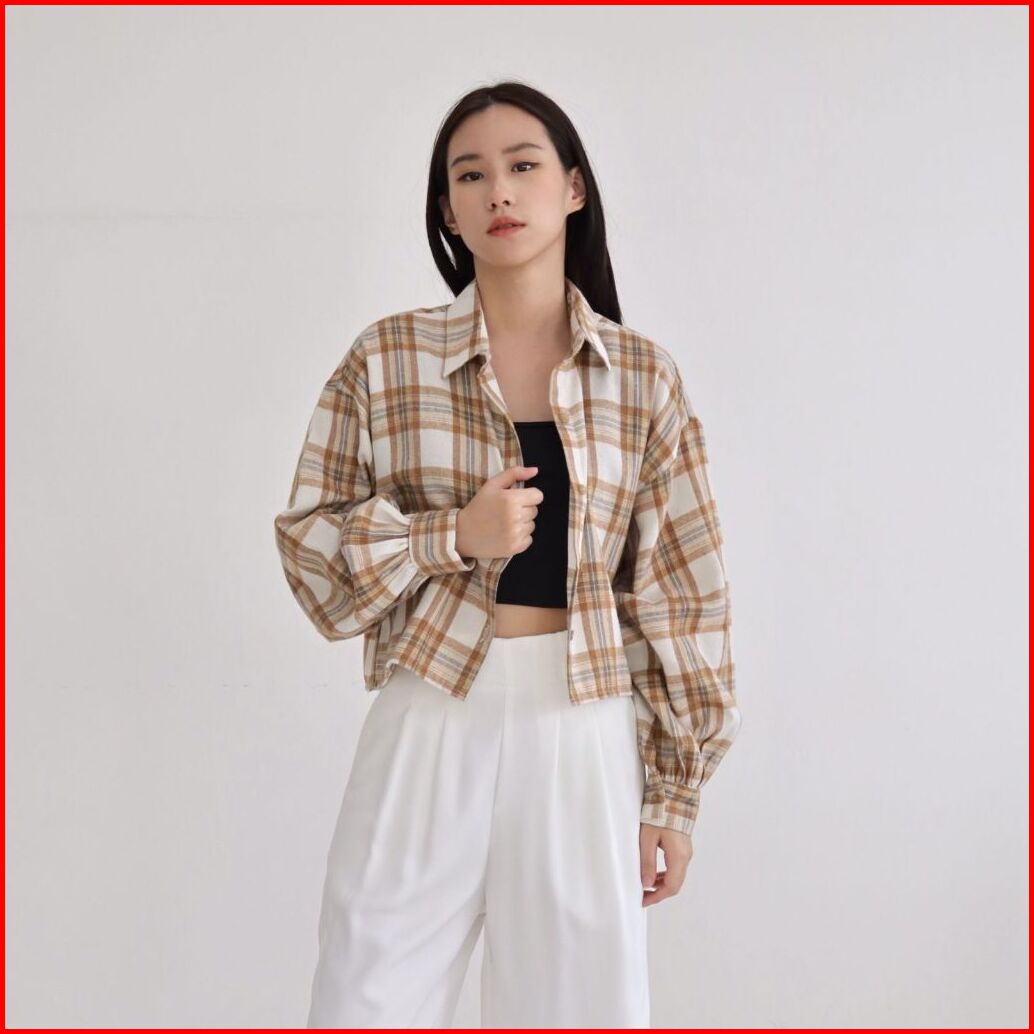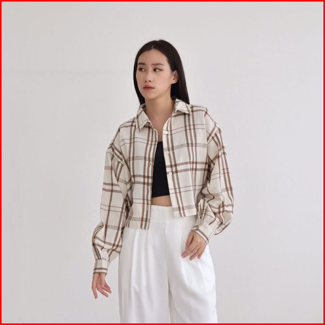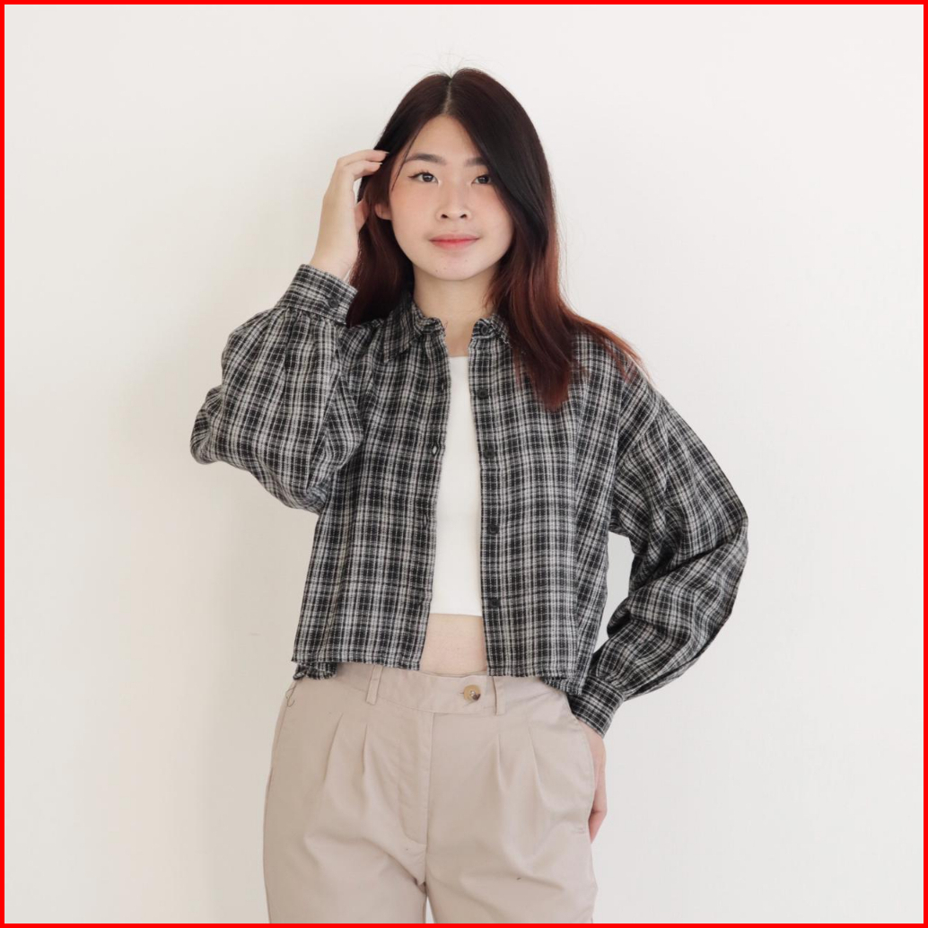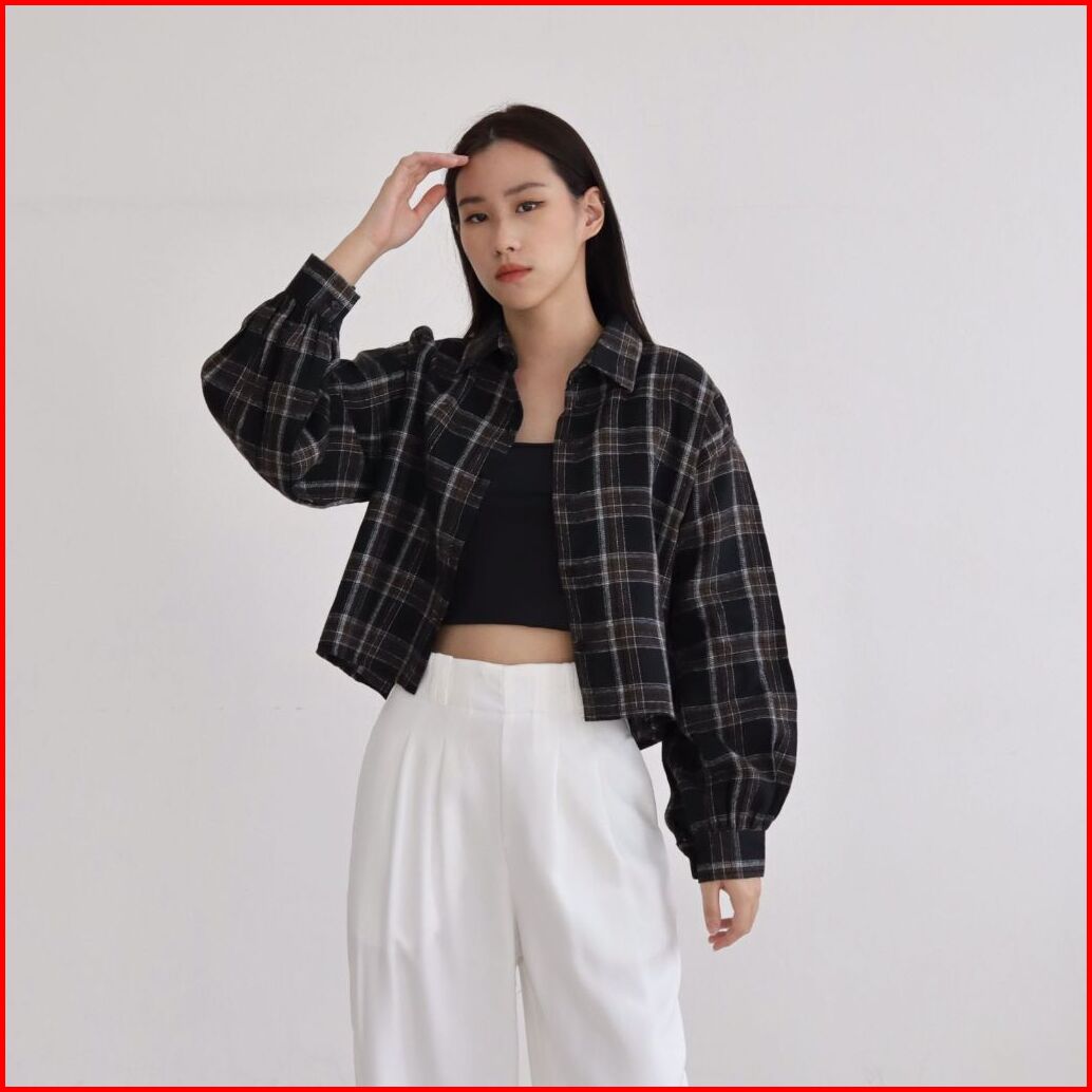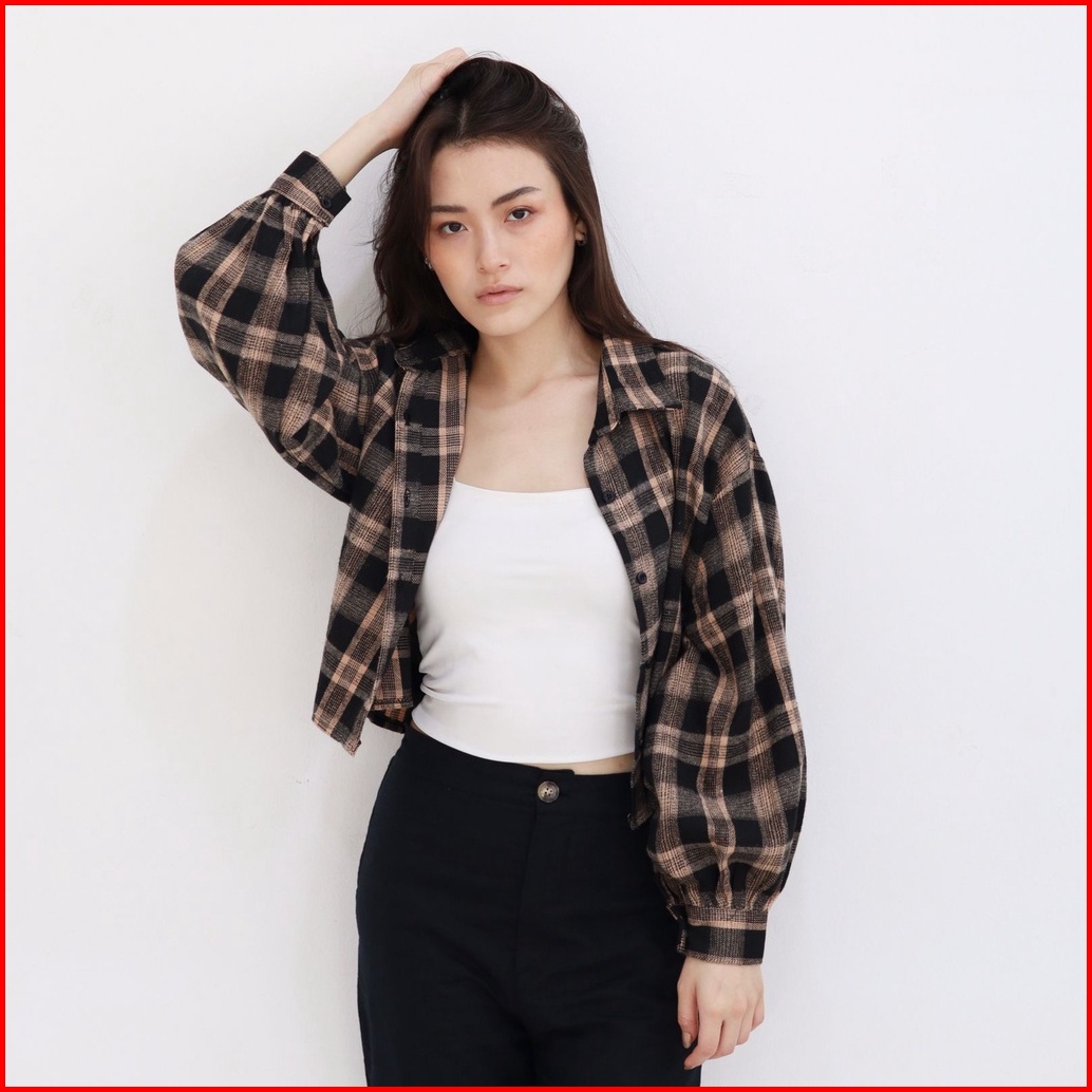 Msmo Anzel Flanel Top Crop Atasan Wanita Kemeja Panjang Wanita